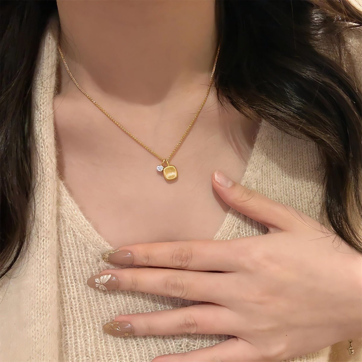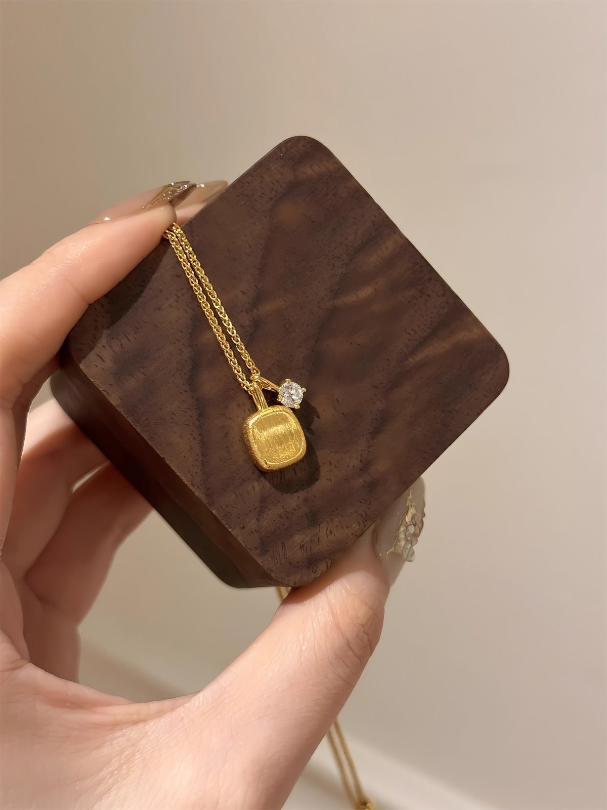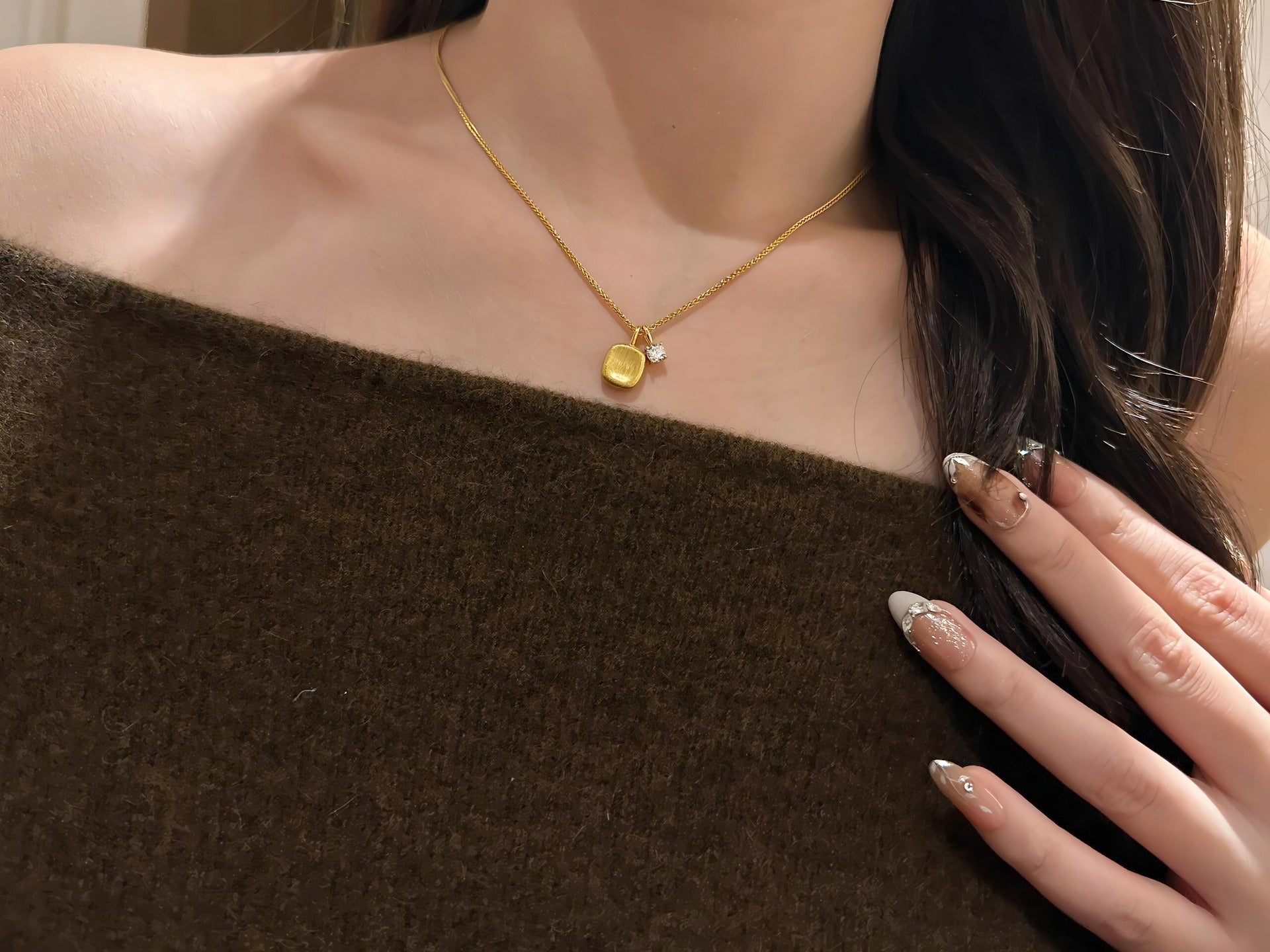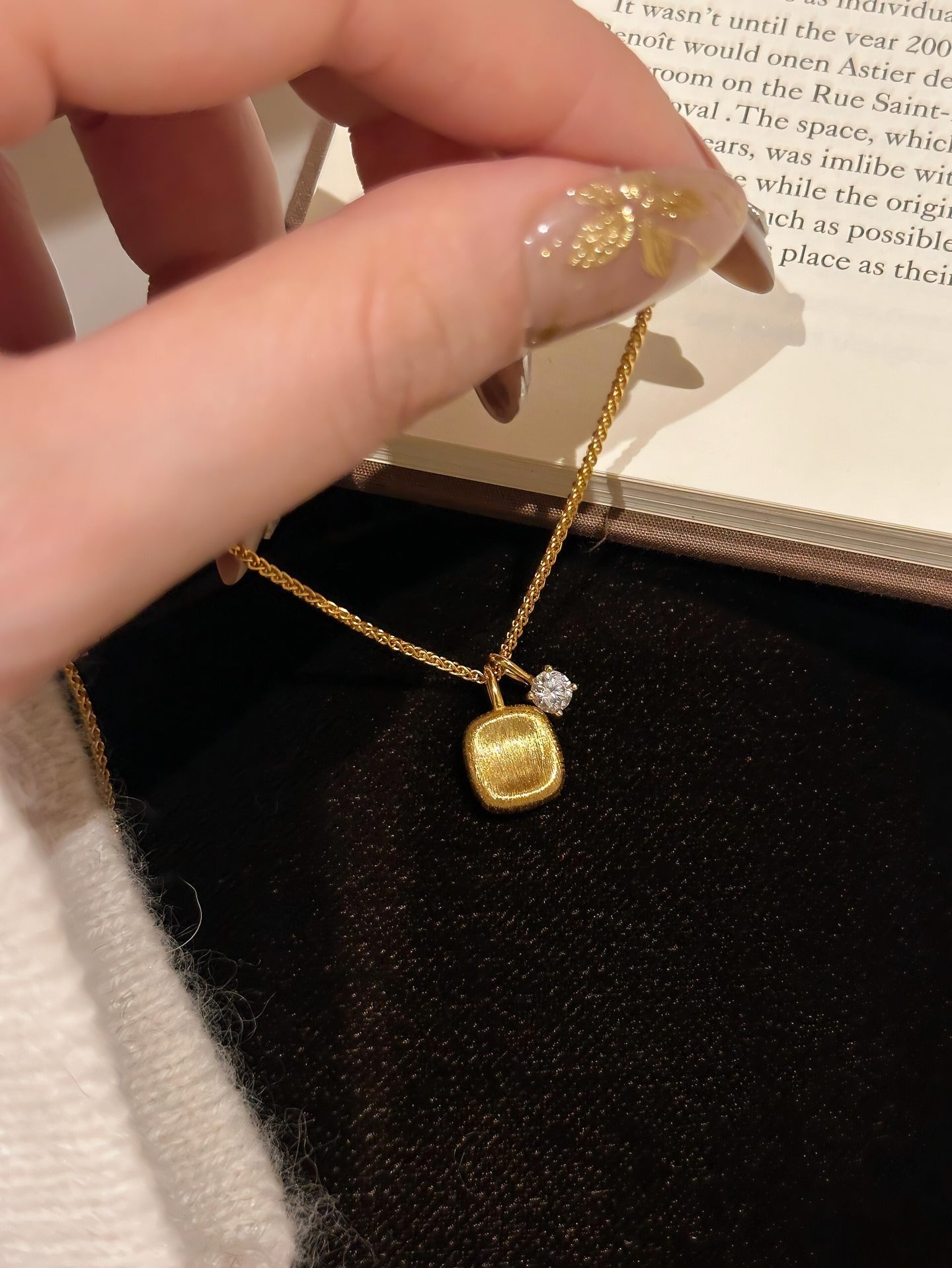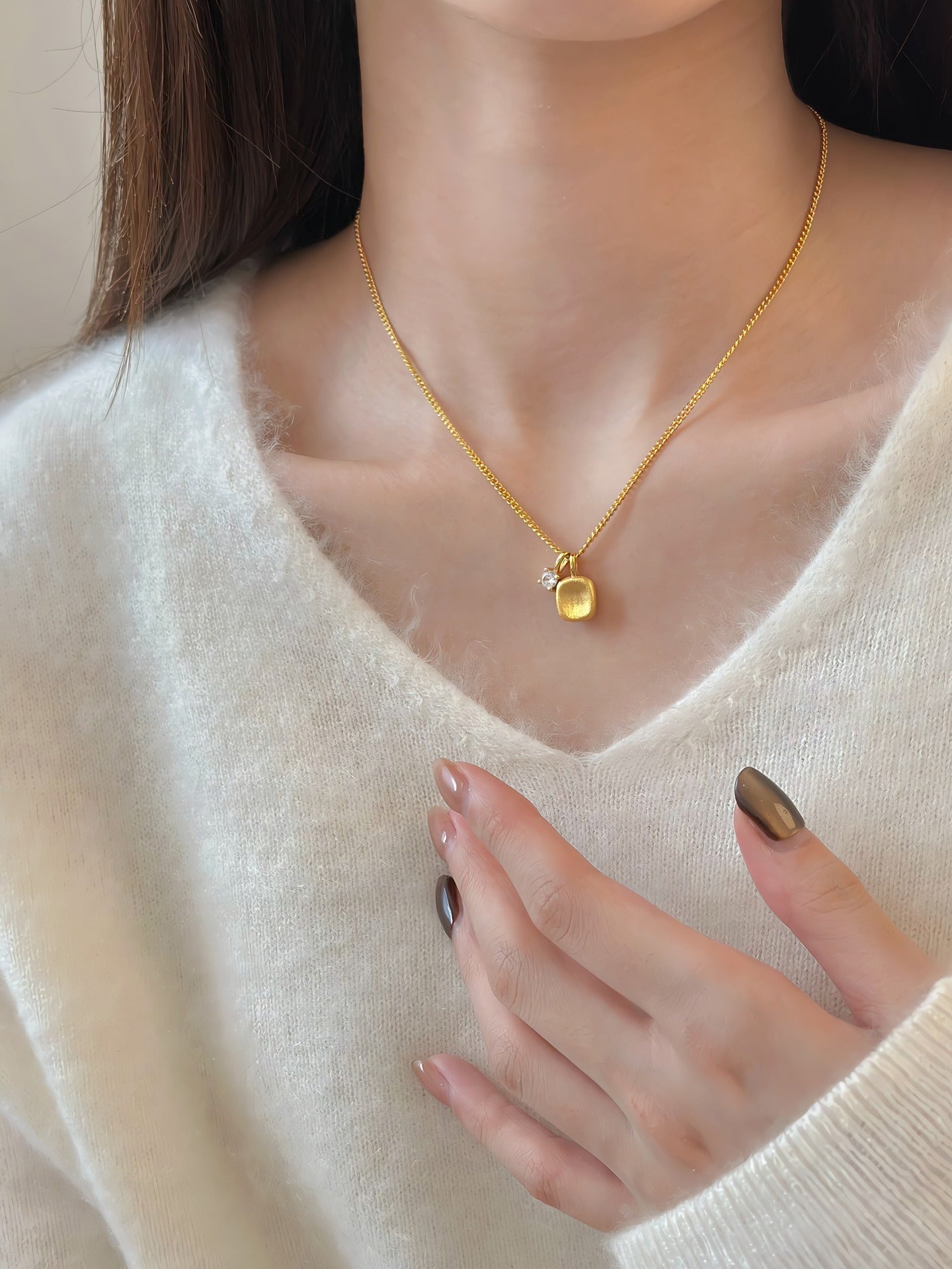 En smuk halskæde i 925S sterlingsølv forgyldt med 14K guld, hvor det matte vedhæng skaber en fin balance mellem enkelhed og elegance. Den bløde, børstede overflade reflekterer lyset diskret og giver smykket et afdæmpet luksuspræg, mens den klare zirkon i midten tilfører et rent, feminint glimt.
