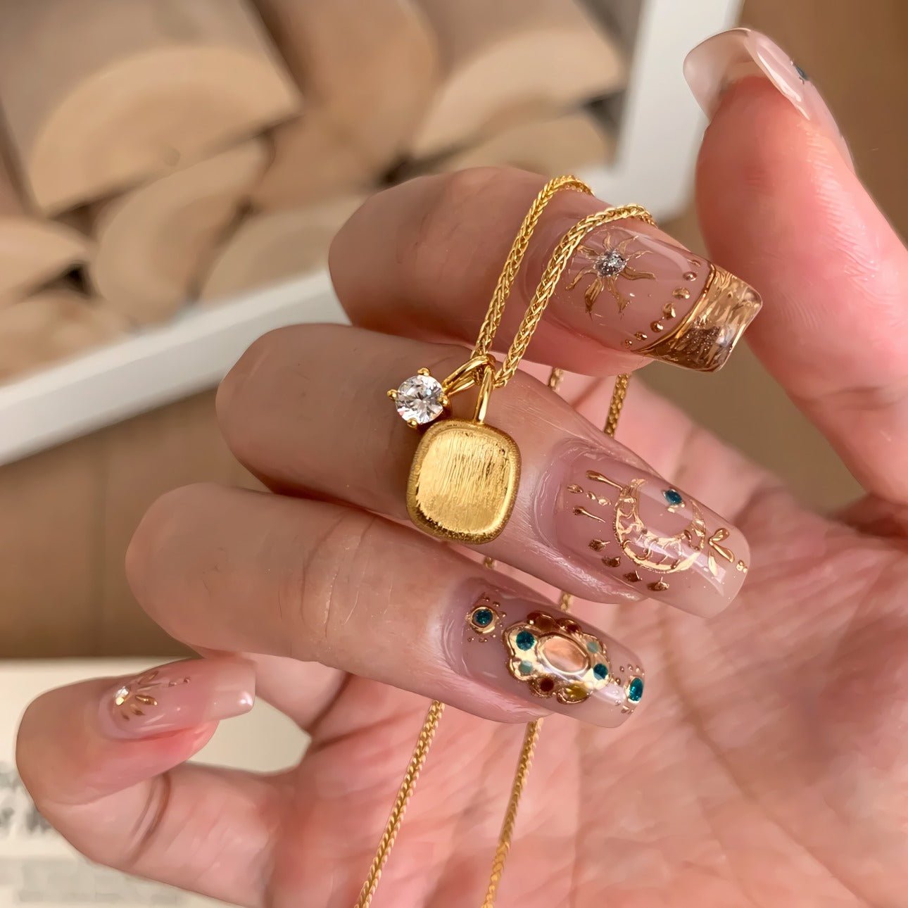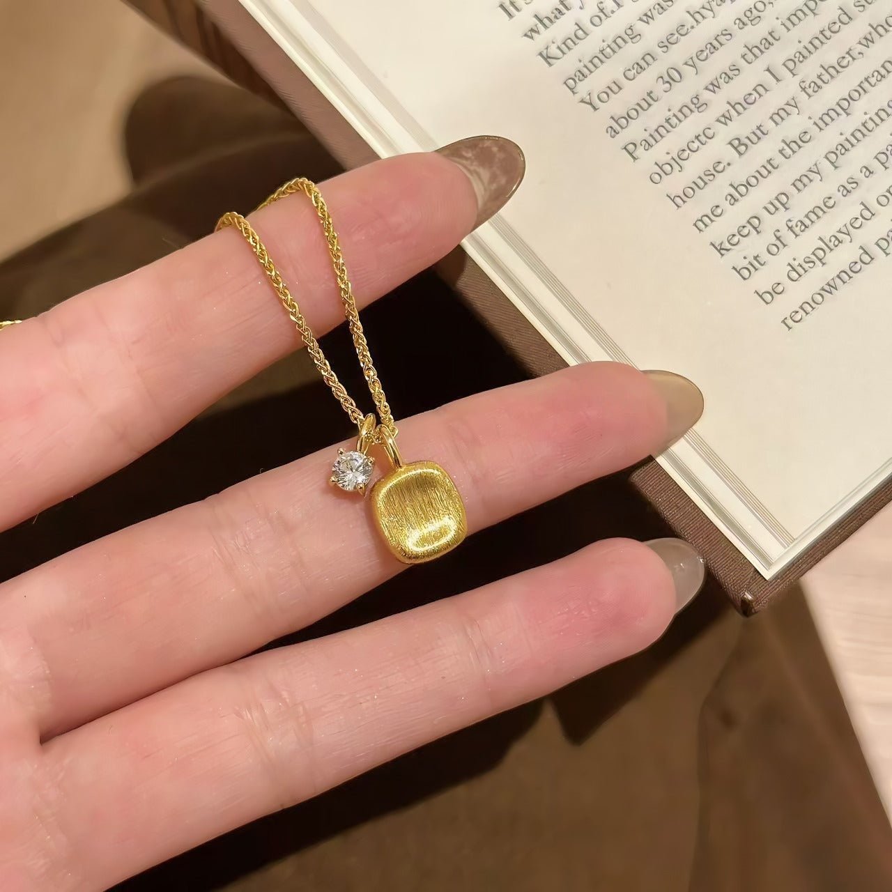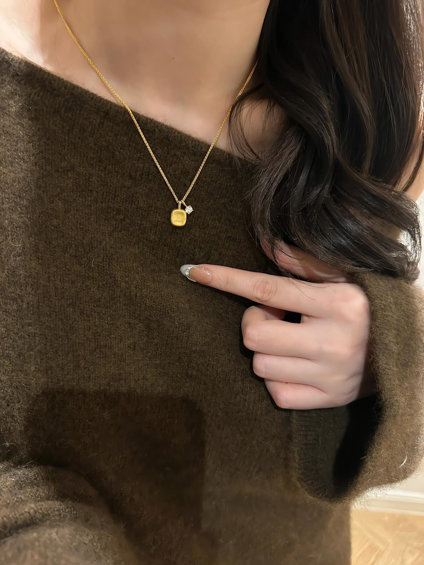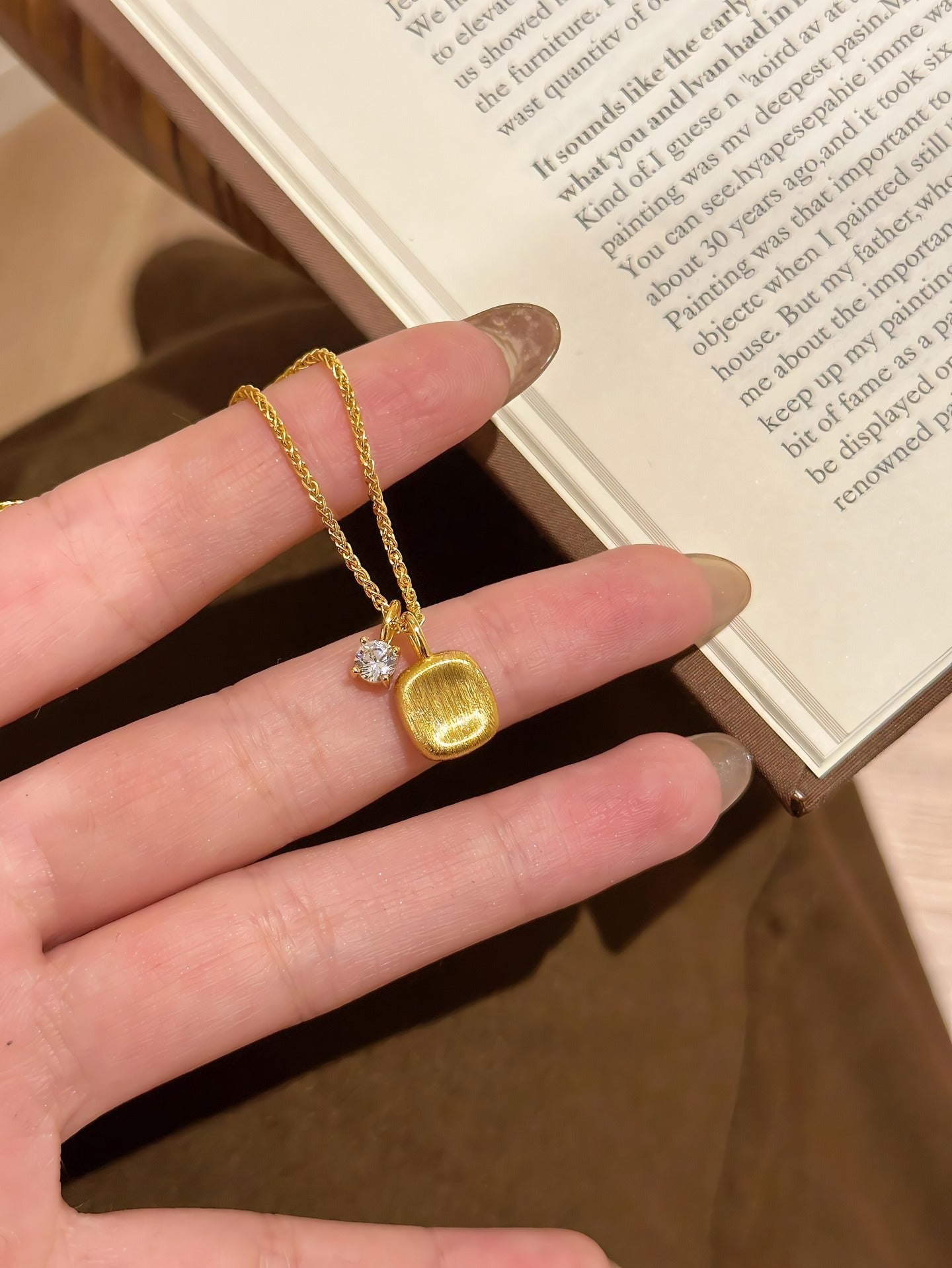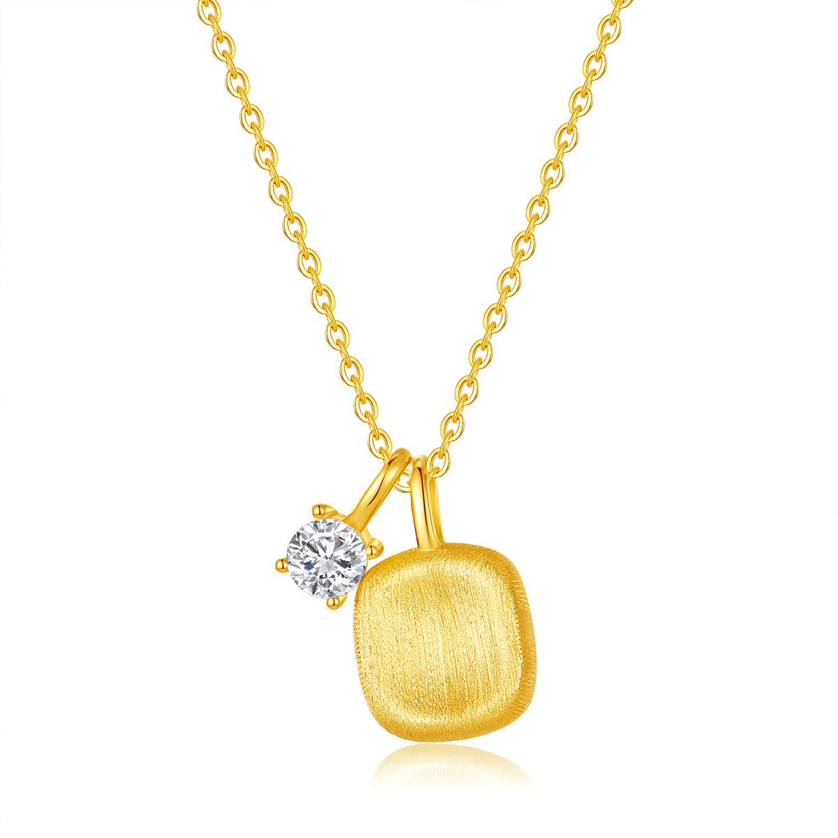 En smuk halskæde i 925S sterlingsølv forgyldt med 14K guld, hvor det matte vedhæng skaber en fin balance mellem enkelhed og elegance. Den bløde, børstede overflade reflekterer lyset diskret og giver smykket et afdæmpet luksuspræg, mens den klare zirkon i midten tilfører et rent, feminint glimt.