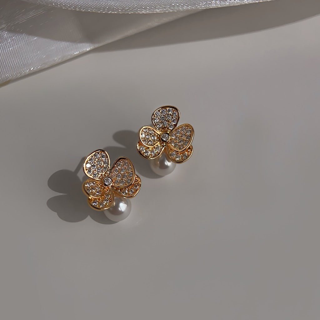 Disse elegante blomsterformede øreringe kombinerer klassisk finesse med moderne charme. Designet som en delikat firkløverblomst, er hver enkelt kronblad omhyggeligt besat med funklende zirkonia-sten, der skaber et smukt skær i lyset. Den nederste del af blomsten fremhæves af en håndpåført harpiksperle, der tilfører et luksuriøst og feminint touch.