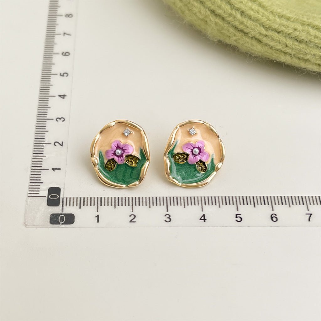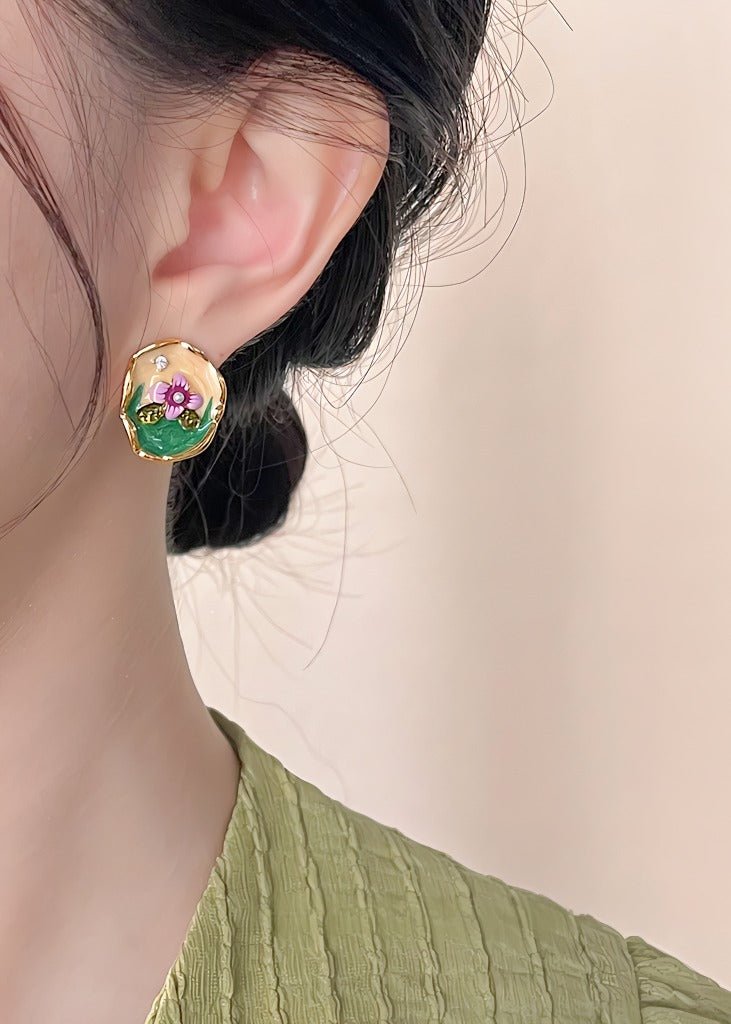 14K Forgyldte S925 Sølvnål Ørestikker med Håndmalet Emalje, Blomstermotiv og Zirkonia