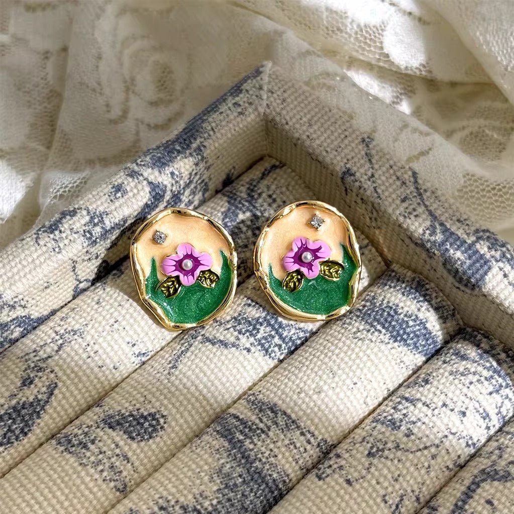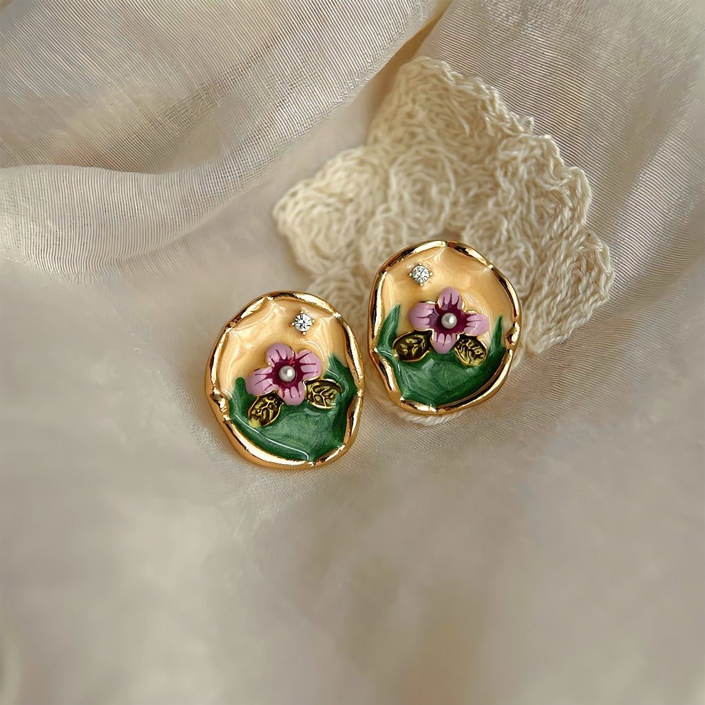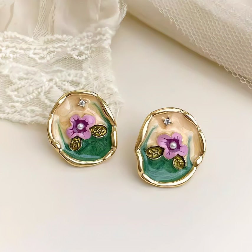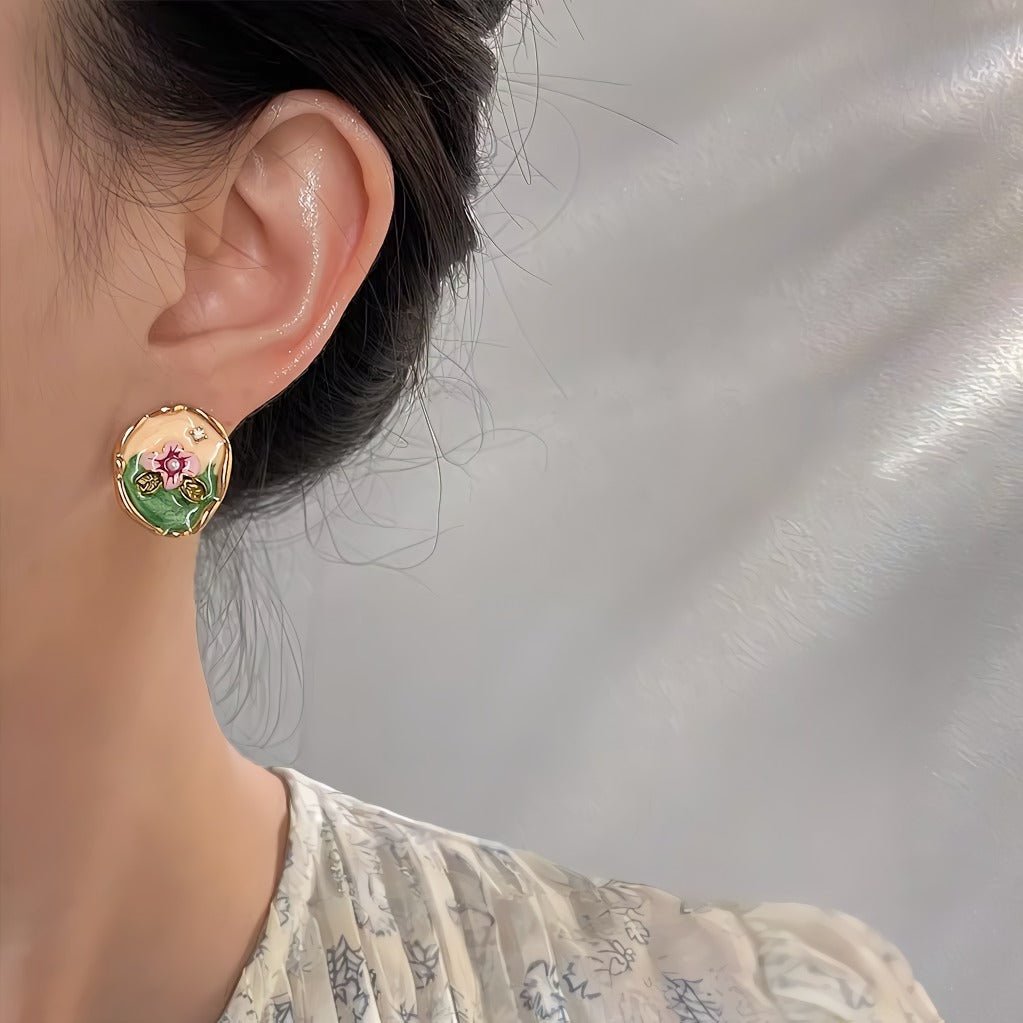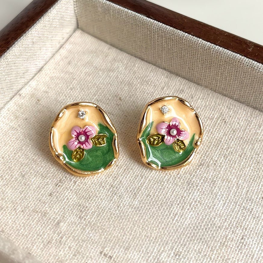 Disse ørestikker har et kunstnerisk og dekorativt design med et håndmalet blomstermotiv som centralt fokus. Den bløde, let uregelmæssige form giver smykket et levende og håndlavet udtryk, hvor hvert element fremstår naturligt og harmonisk.