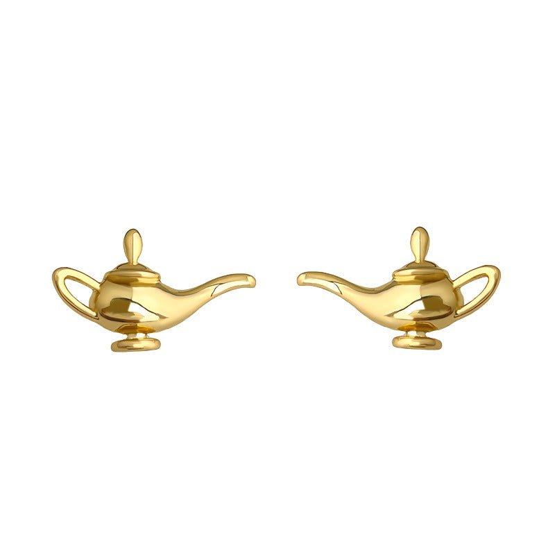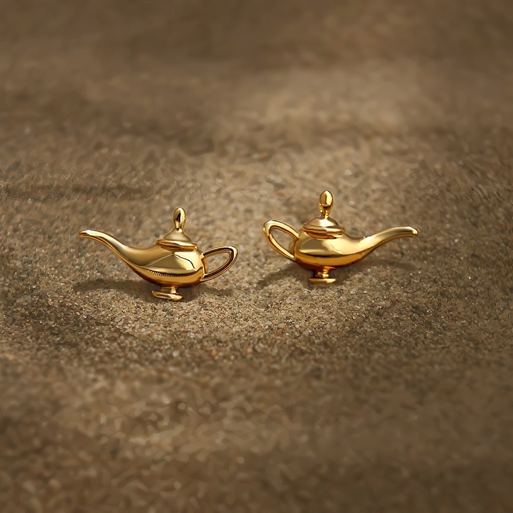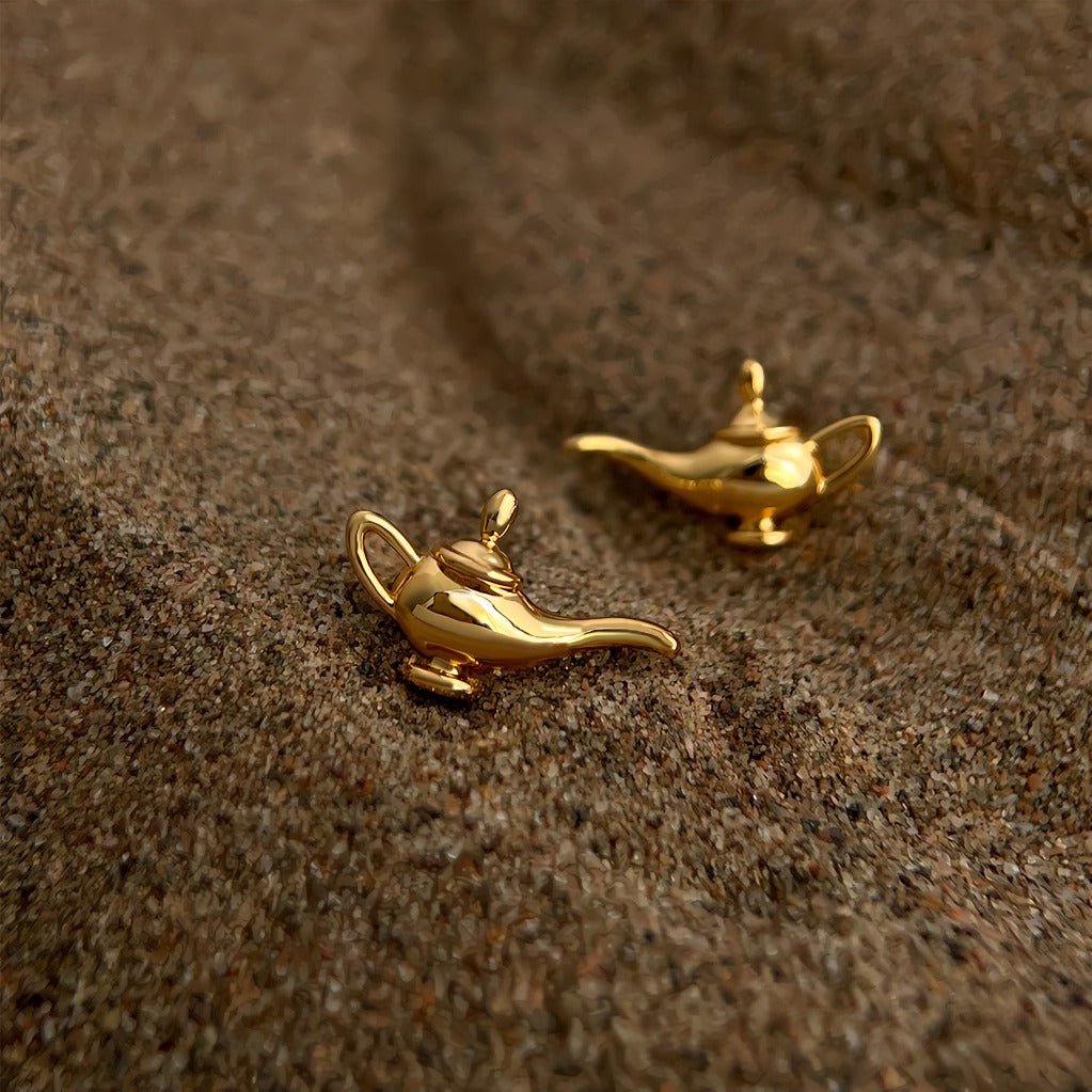 Disse ørestikker er inspireret af den ikoniske Aladdin-lampe og bringer et strejf af eventyr og orientalsk mystik ind i dit smykkelook. Den lille skulpturelle lampeform er udført med bløde, elegante kurver og en spejlblank overflade, der giver et luksuriøst gyldent skær mod huden.