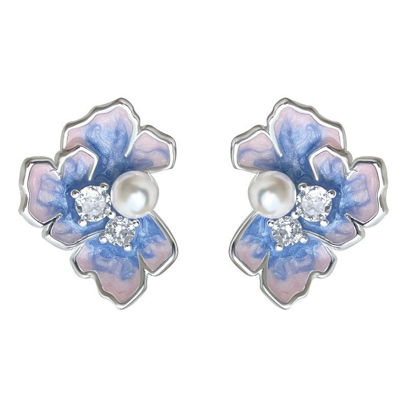 Øreringene er dekoreret med mikroindfattede zirkonia, som tilfører et diskret glimt, samt en håndmonteret højglans perle, der skaber et raffineret fokuspunkt i designet. De håndpåførte emaljedetaljer fremhæver blomstens form og giver hvert smykke et levende og kunstnerisk udtryk.