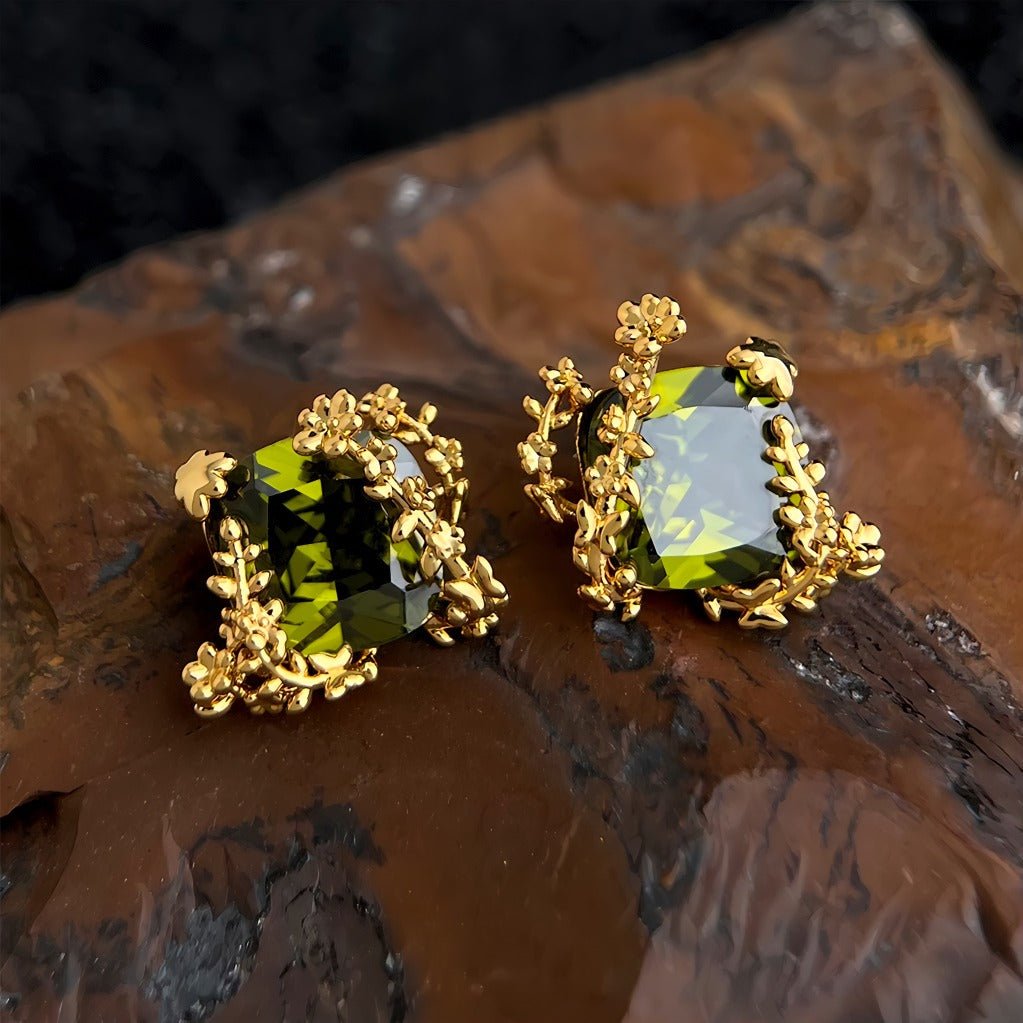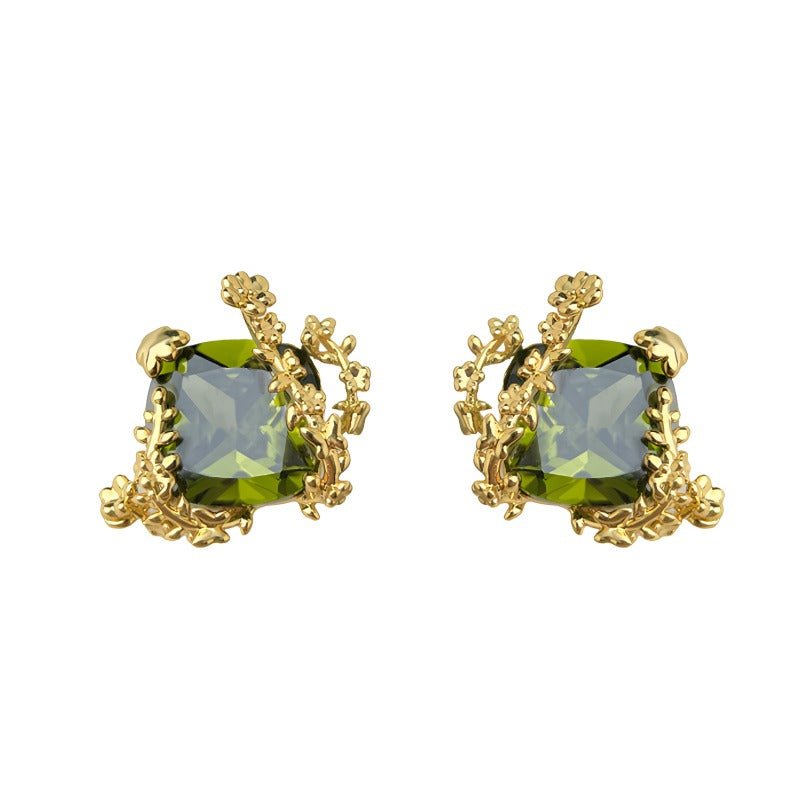 Blomsterdesignet, som er omfavnet af fine zirkonia-stene, afspejler en delikat balance mellem naturens skønhed og den moderne æstetik. De grønne zirkonier i midten fungerer som blomsternes hjerte, hvilket giver dem et levende og indbydende udtryk. Hver sten er omhyggeligt valgt for at sikre det maksimale lysfald og en strålende glans.