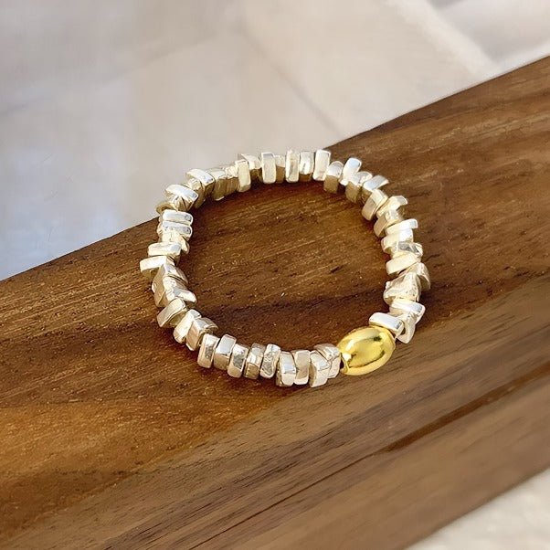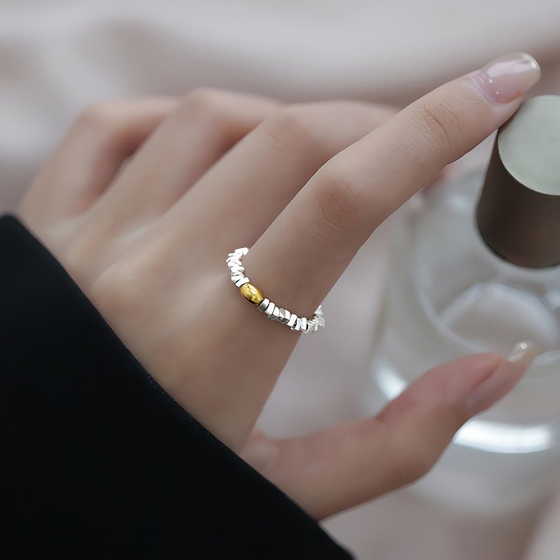 Denne elastiske ring er designet med små facet-slebne sølvelementer, trukket på en stærk og fleksibel elastiksnor, som gør ringen yderst komfortabel og let at bære. Det skinnende sølvlook kombineret med en elegant gylden oval bead giver ringen et moderne, stilrent og iøjnefaldende udtryk. Et smykke, der passer perfekt til både hverdagsbrug og elegante outfits.