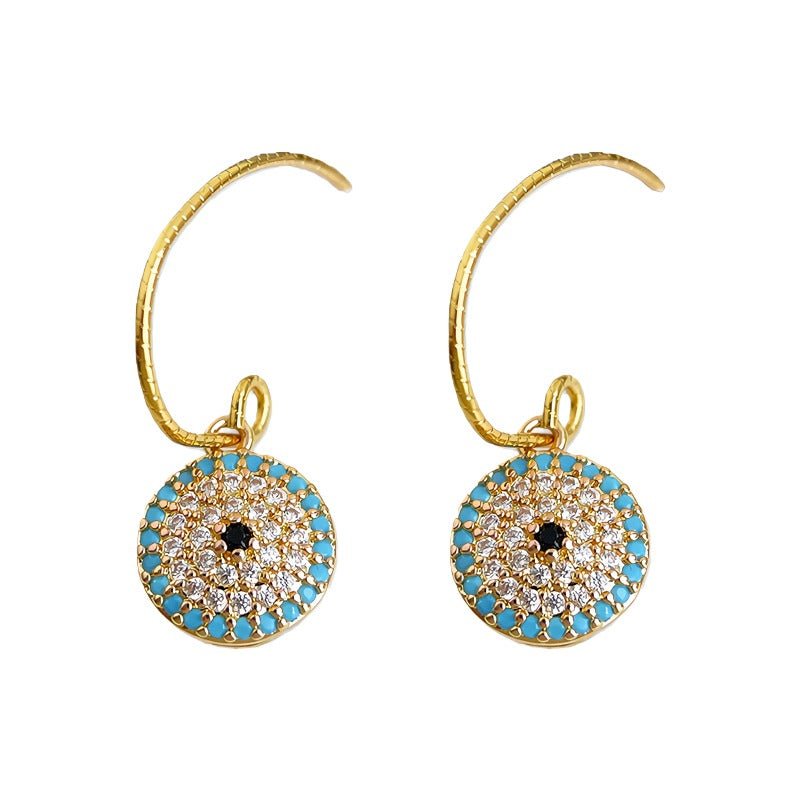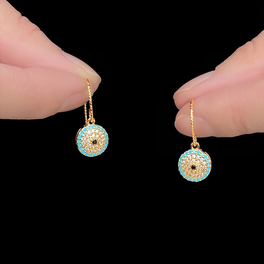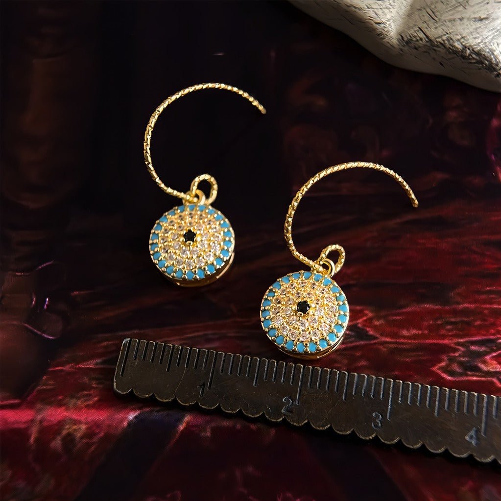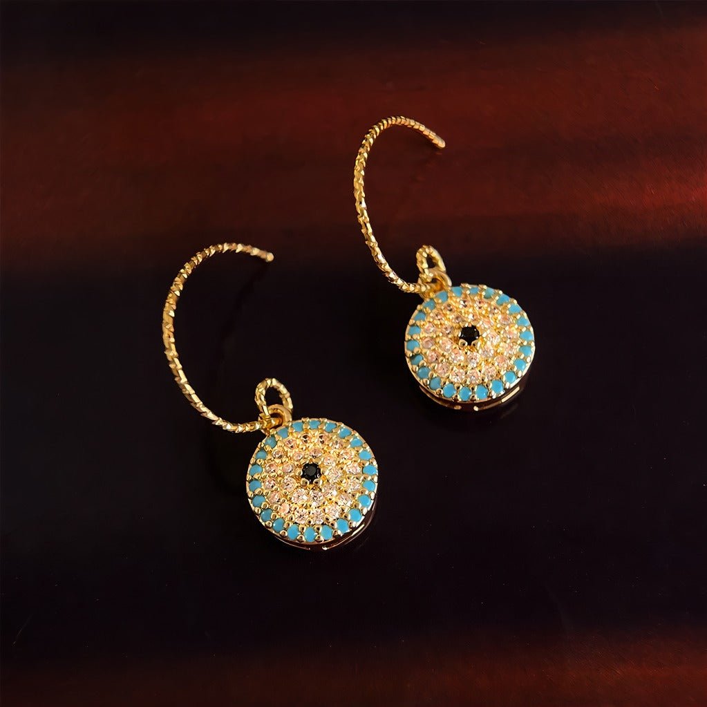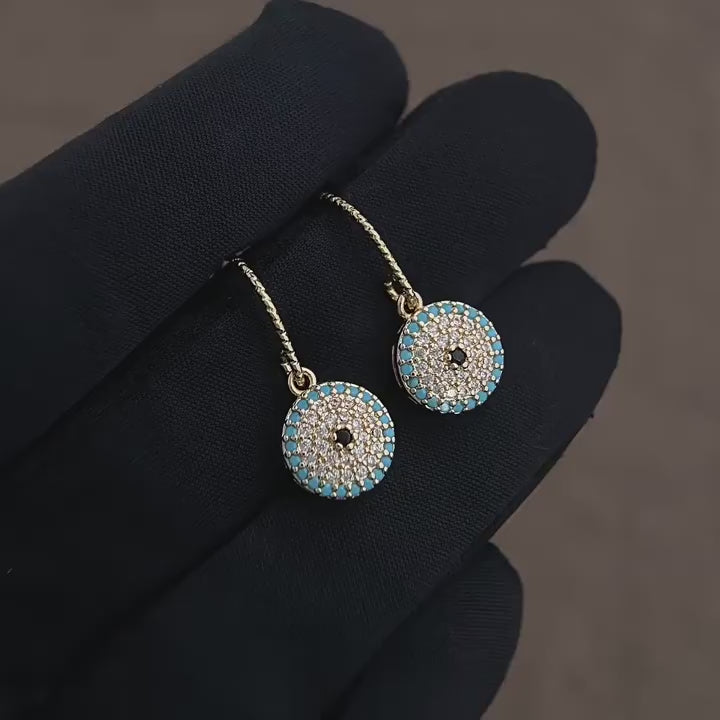 Diese orientalisch inspirierten Ohrringe verbinden vintage Eleganz mit modernen Details. Der runde Anhänger ist als feine Mosaikarbeit gestaltet, bei der türkise Zirkonia-Steine ein dekoratives Muster um einen goldenen Kern bilden. Der Kontrast zwischen der warmen 14K Vergoldung und den kühlen türkisen Tönen erzeugt ein exklusives Farbenspiel, das das Licht aus allen Blickwinkeln einfängt.