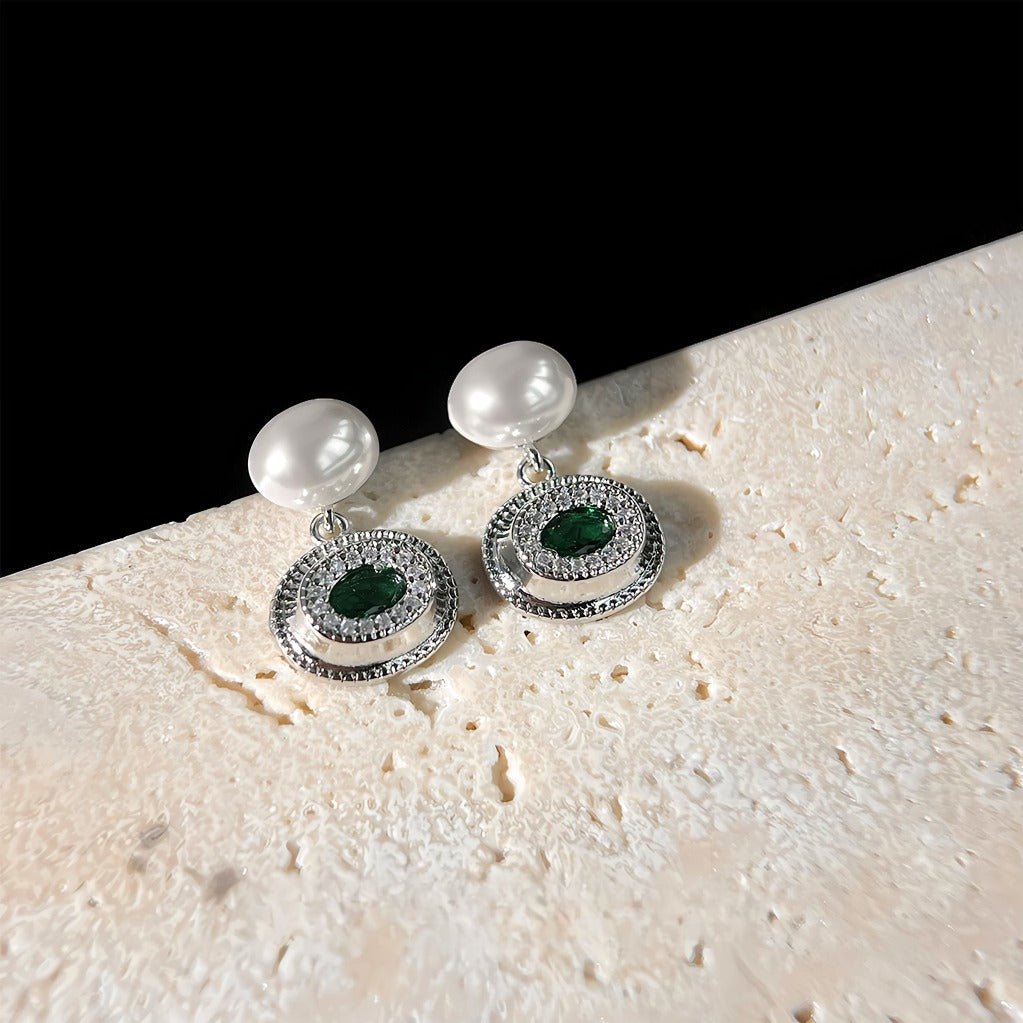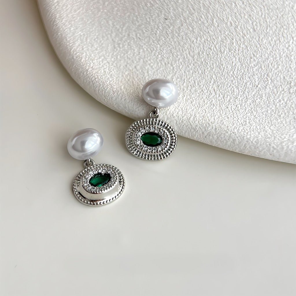 • Material: Kupferbasis mit Weißgold beschichtet, geschmückt mit mikrogefassten Zirkonen, Hochglanzperlen und einem smaragdgrünen synthetischen Kristall. Die Ohrringe haben Stifte aus 925 Sterling Silber, die Komfort gewährleisten und ideal für empfindliche Ohren sind.