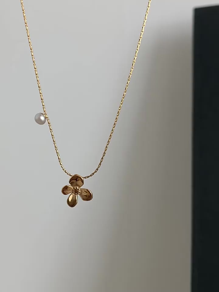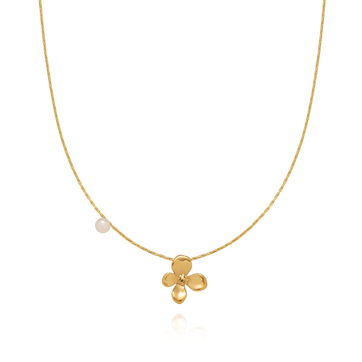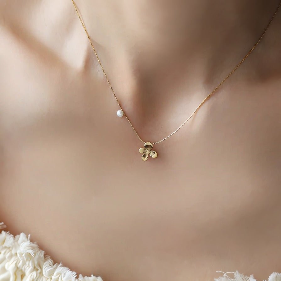 This elegant necklace combines a delicate floral design with a natural freshwater pearl, creating a feminine piece with a light and refined appearance. The flower is shaped with soft, rounded petals in a harmonious balance, giving a calm and timeless expression close to the collarbone.