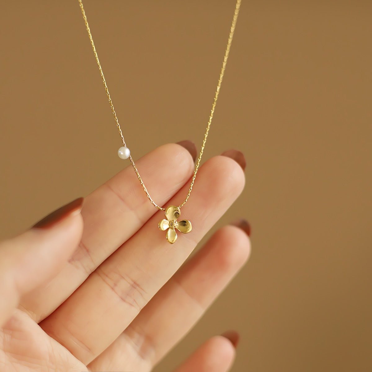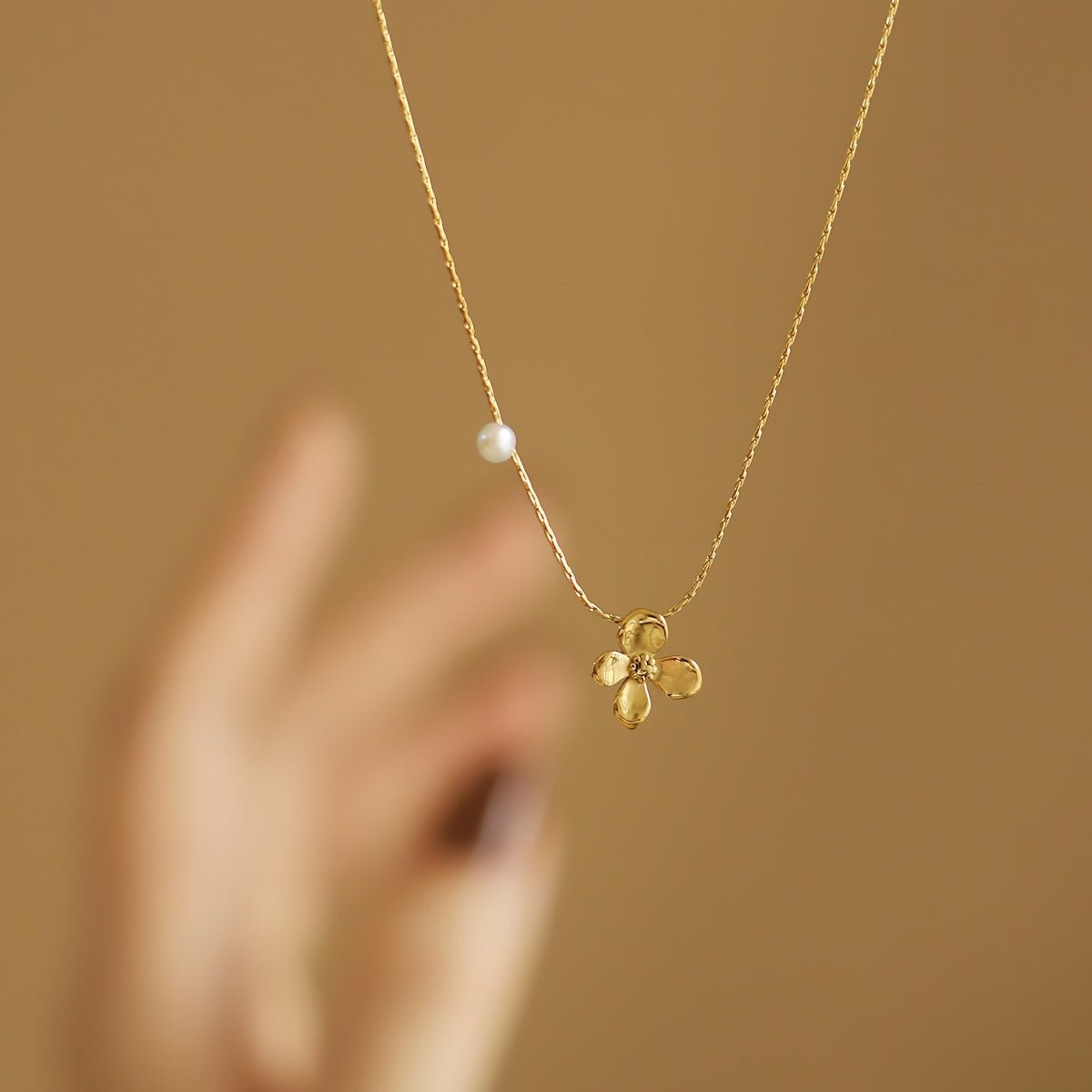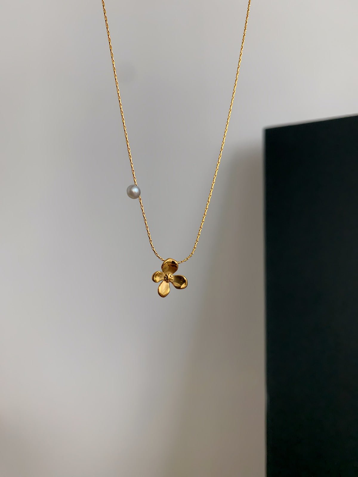 This elegant necklace combines a delicate floral design with a natural freshwater pearl, creating a feminine piece with a light and refined appearance. The flower is shaped with soft, rounded petals in a harmonious balance, giving a calm and timeless expression close to the collarbone.