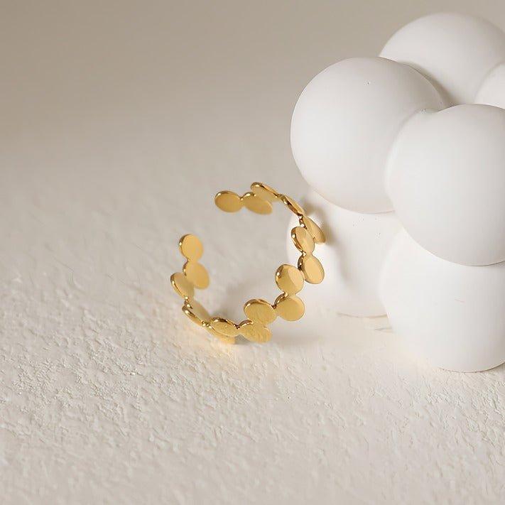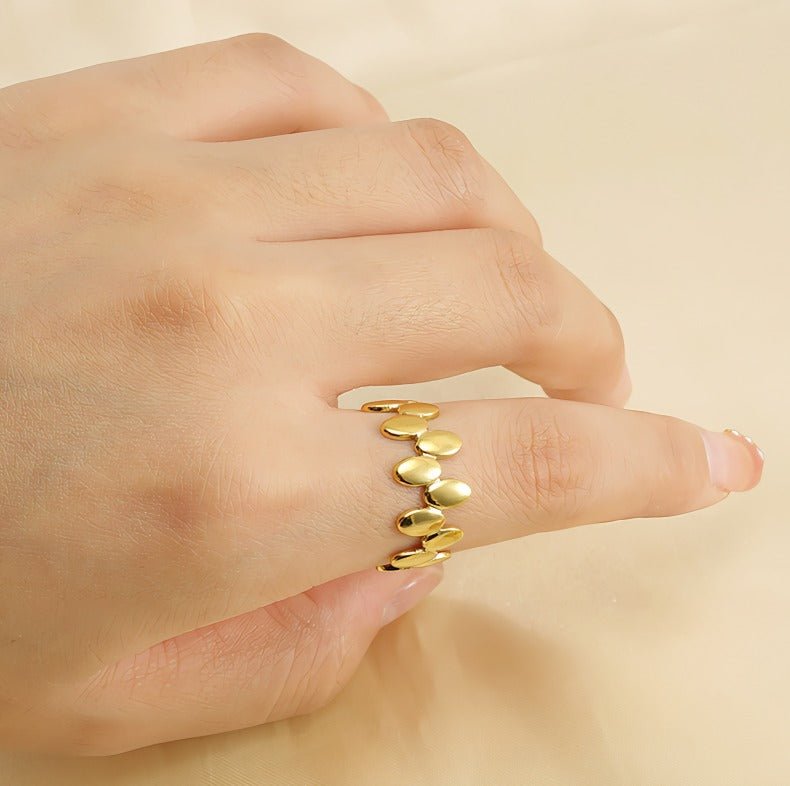 The ring's design is built around repeating oval links that merge into a fluid and cohesive visual language. The soft, rounded shapes give a calm and balanced expression that feels both modern and timeless at once. Each oval link is slightly domed so the ring catches light from different angles and creates a subtle play of shine in motion.