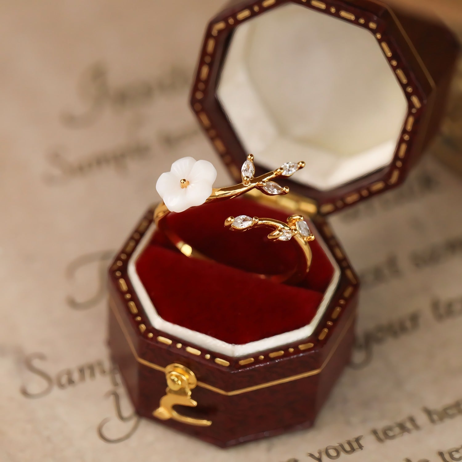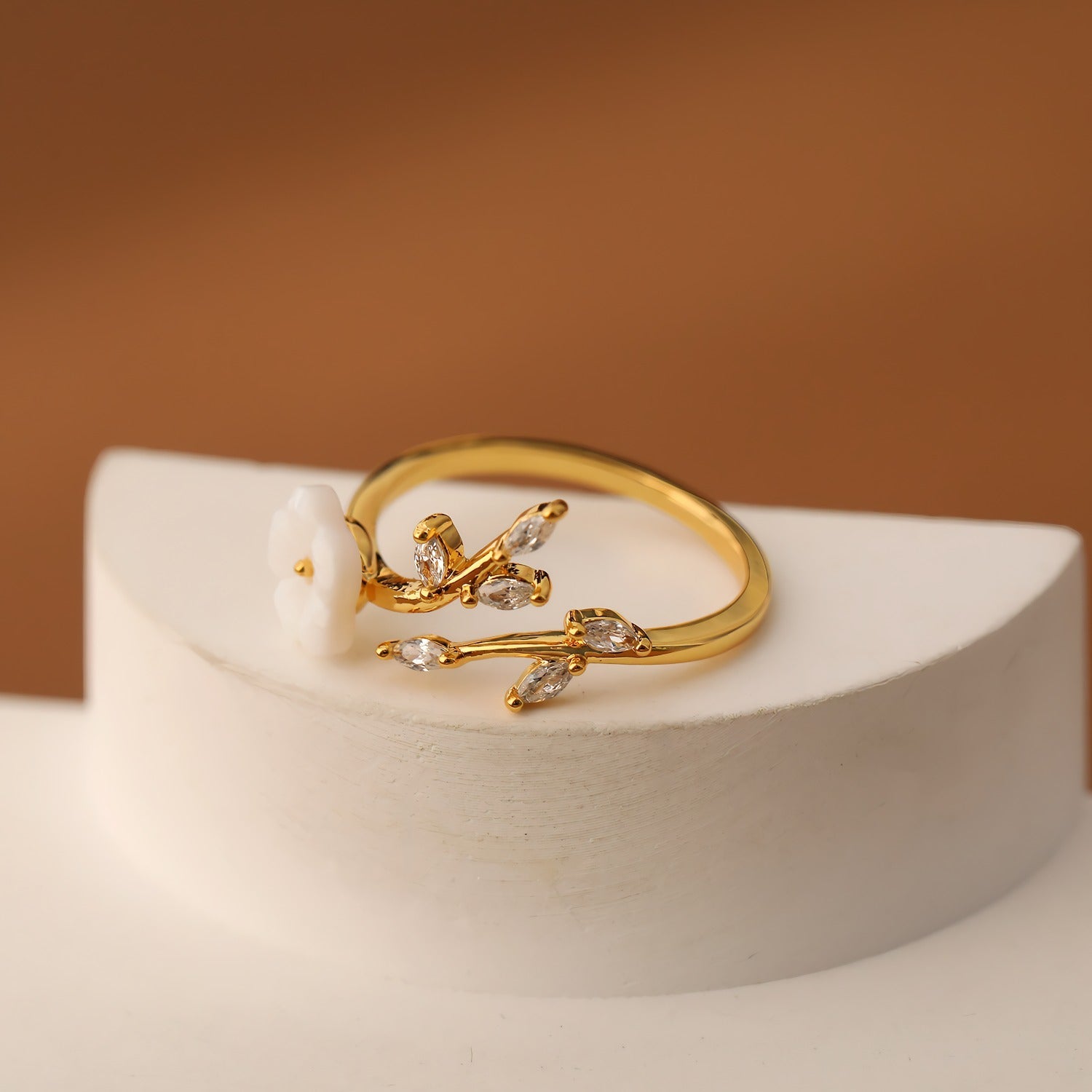 This romantic ring combines the grace of nature with timeless elegance. The design is inspired by blooming branches, featuring a delicate white flower at the center surrounded by sparkling zirconia stones. The 18K gold-plated copper base adds a warm golden glow, while the hand-set details provide an exclusive look.