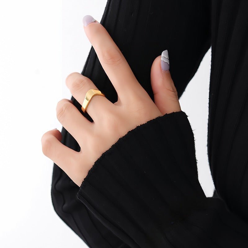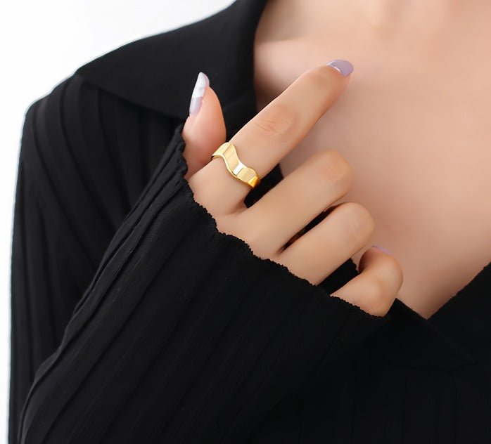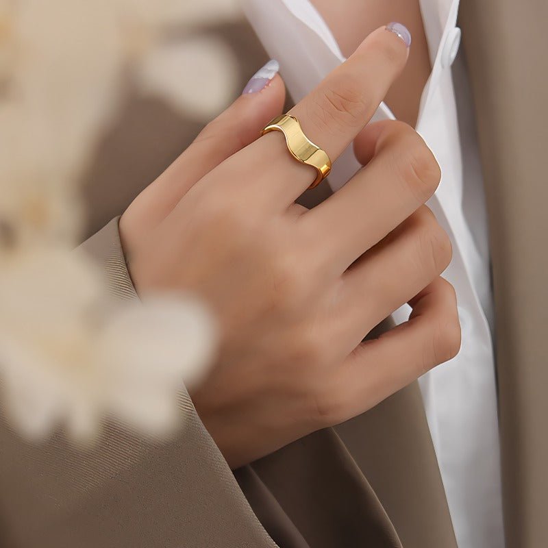 This elegant wave ring is designed with a modern and minimalist expression, making it a timeless piece in any wardrobe. The ring is made of durable titanium steel with an exclusive 18K gold plating, giving it a warm and luxurious glow.