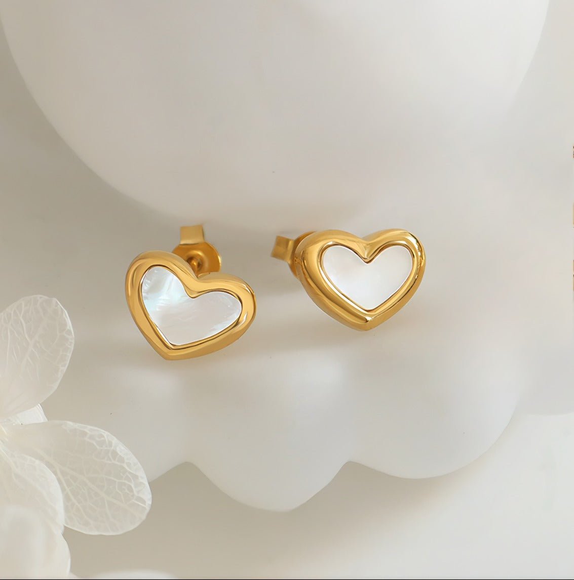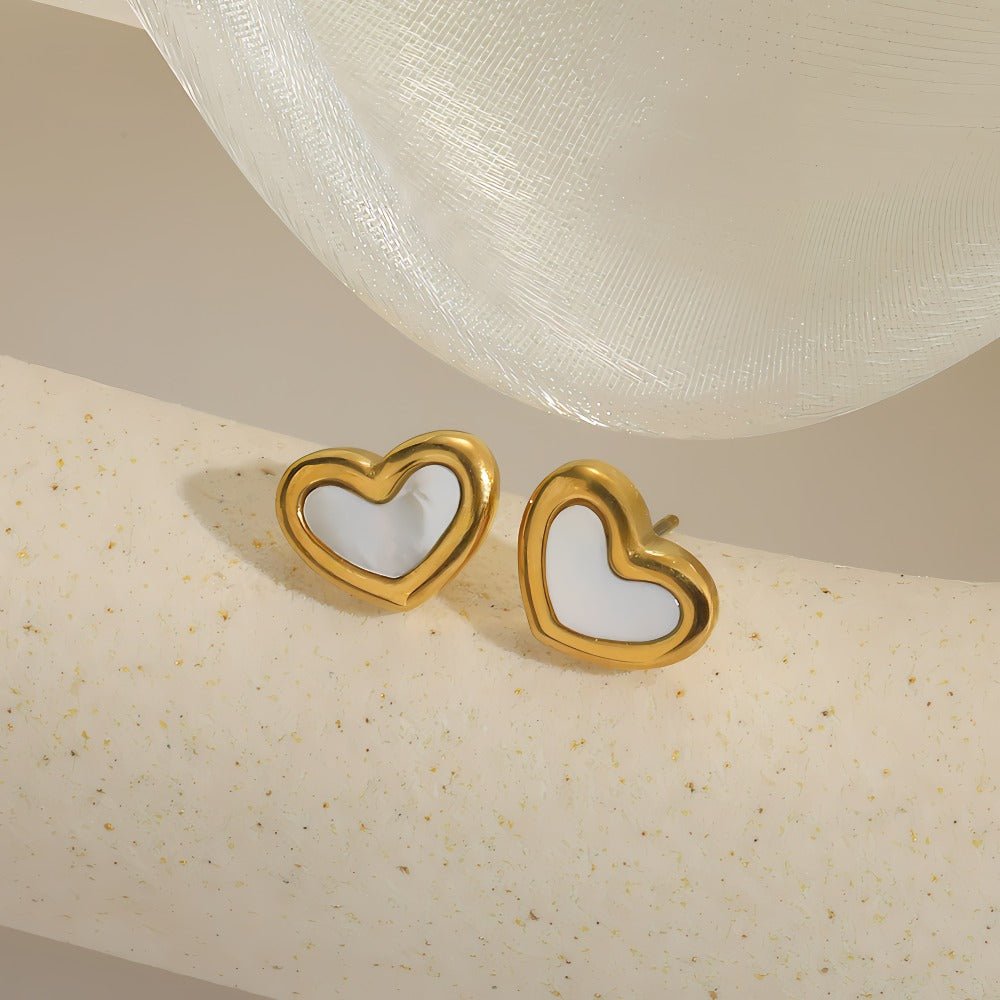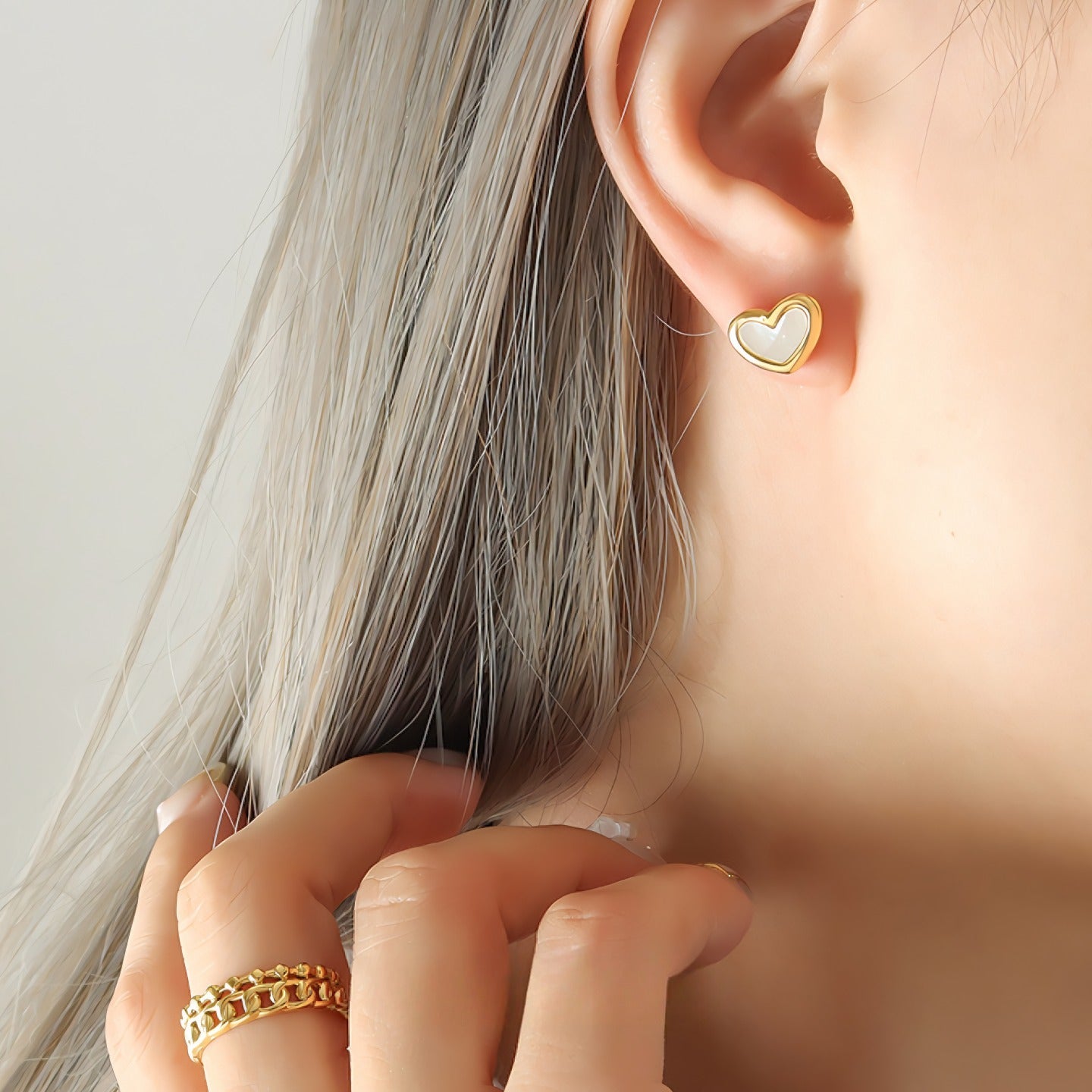 Deze romantische hartvormige oorbellen combineren klassieke vrouwelijkheid met moderne elegantie. Het ontwerp is uitgevoerd in duurzaam titaniumstaal met een prachtige 18K vergulding, die een warme gouden glans geeft. In het midden siert het hart met witte parelmoer, wat een natuurlijke glans en een exclusieve uitstraling toevoegt.