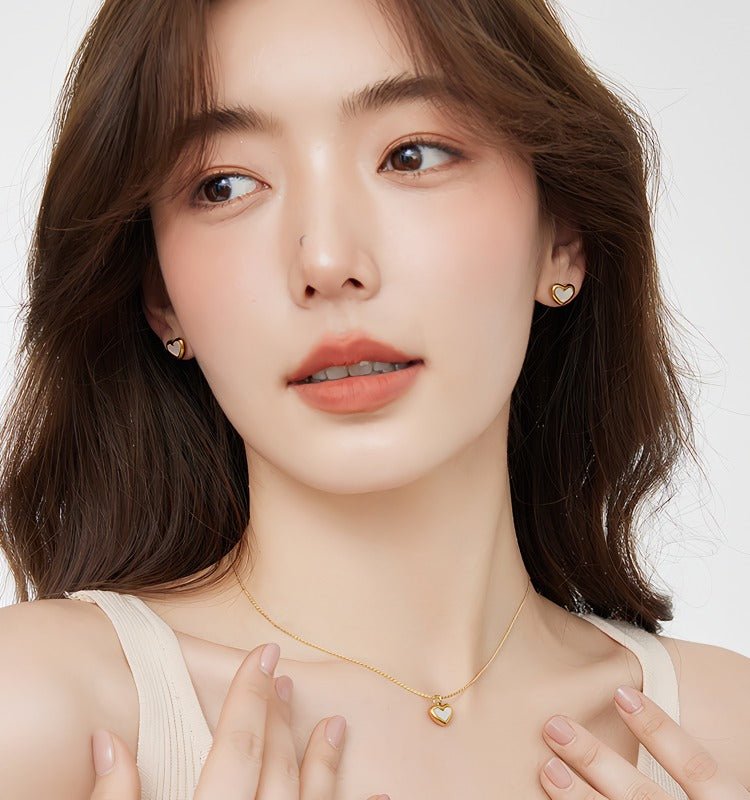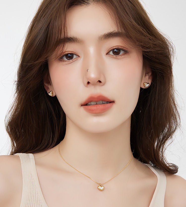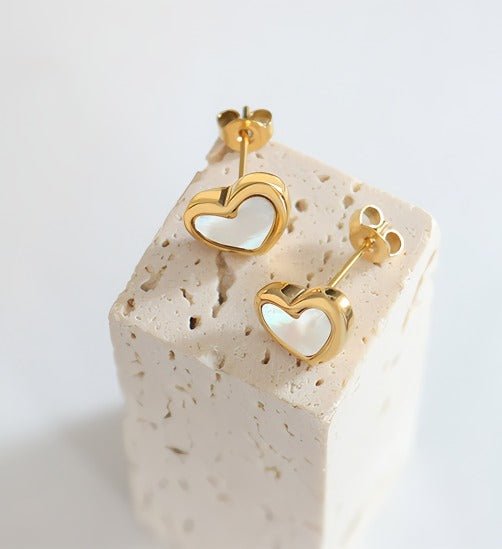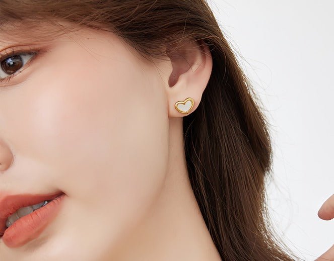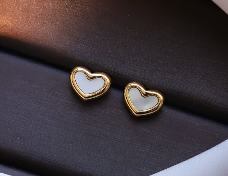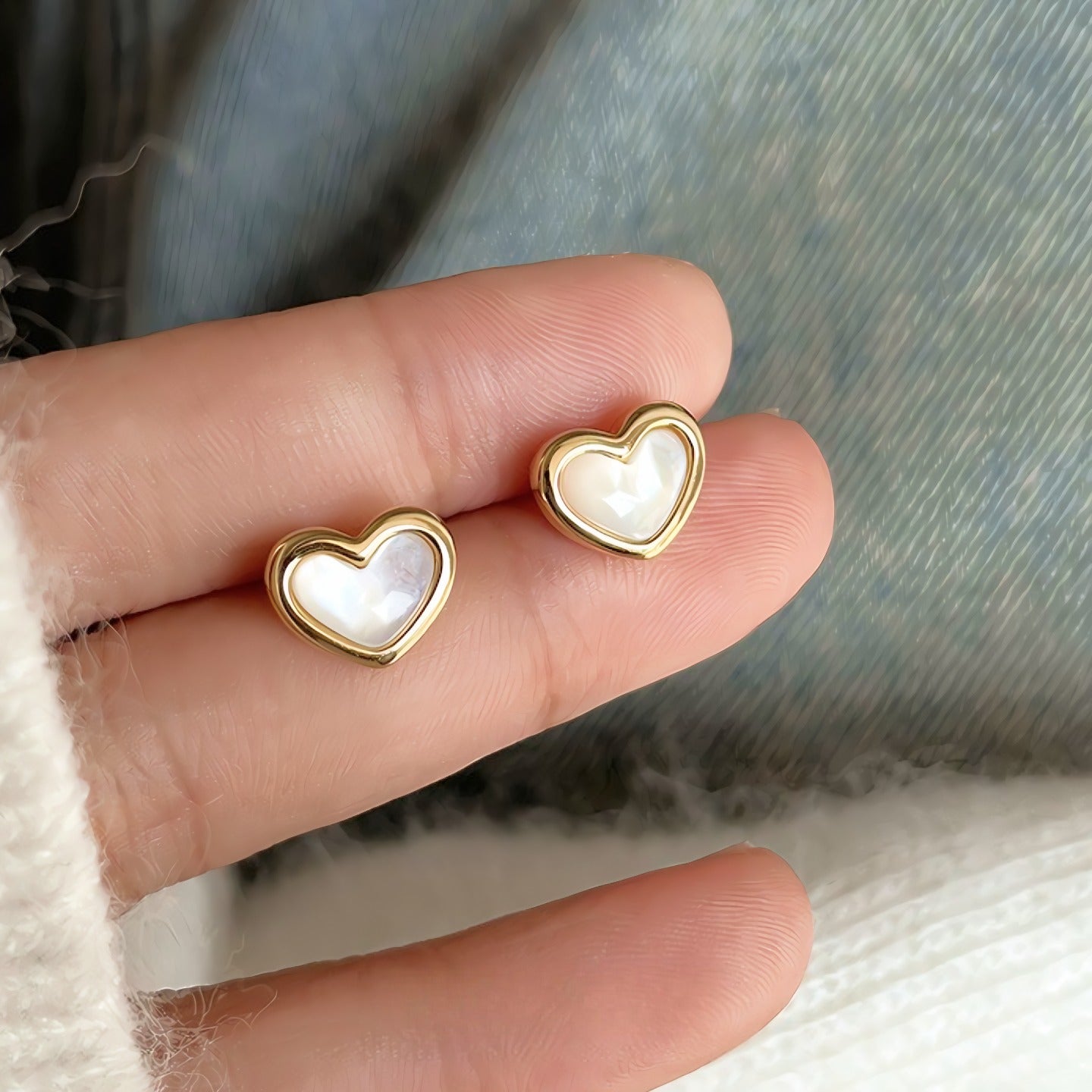 Deze romantische hartvormige oorbellen combineren klassieke vrouwelijkheid met moderne elegantie. Het ontwerp is uitgevoerd in duurzaam titaniumstaal met een prachtige 18K vergulding, die een warme gouden glans geeft. In het midden siert het hart met witte parelmoer, wat een natuurlijke glans en een exclusieve uitstraling toevoegt.