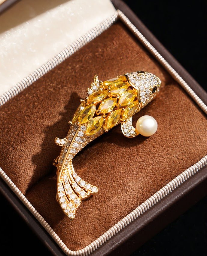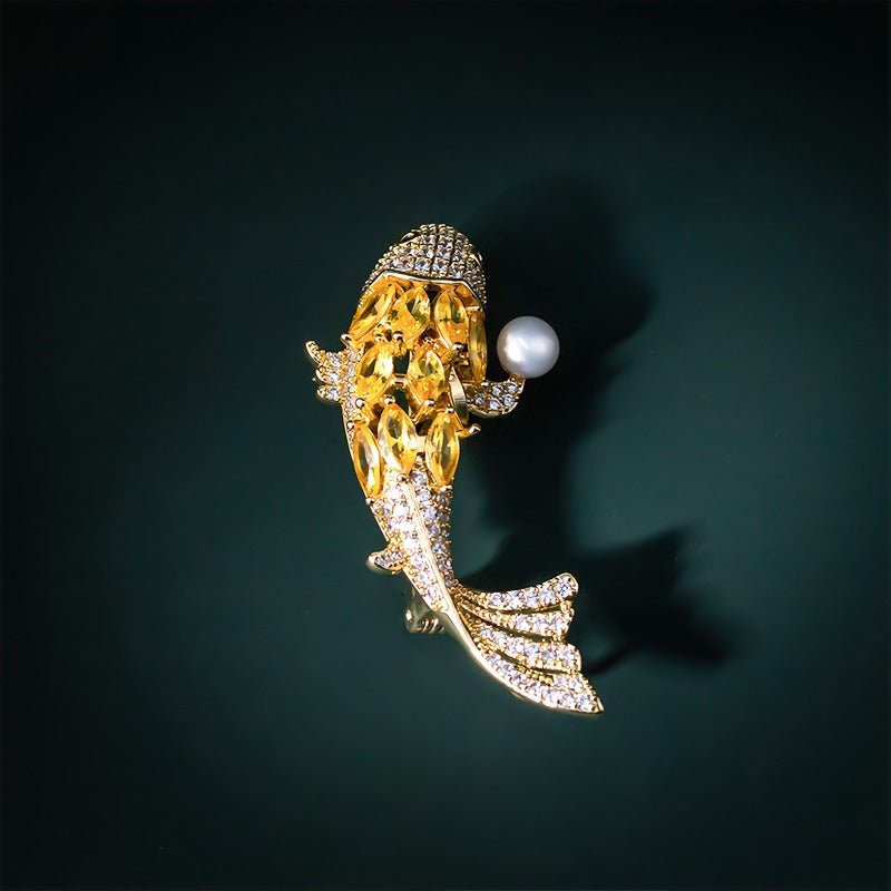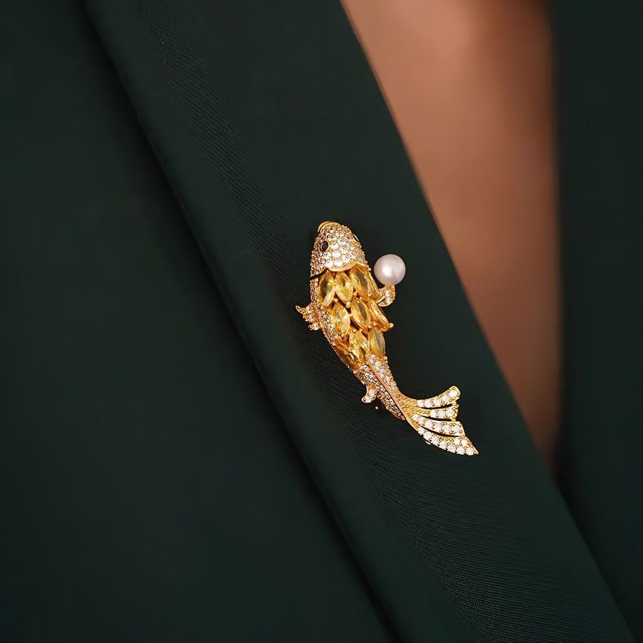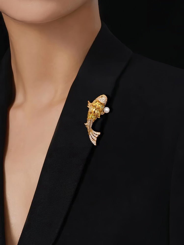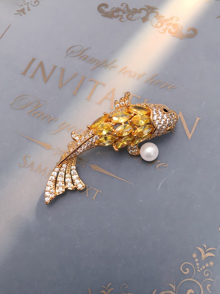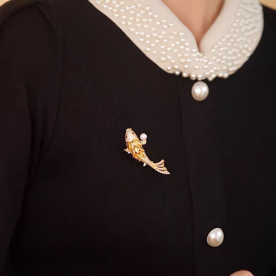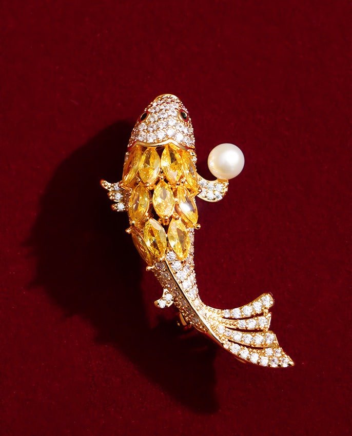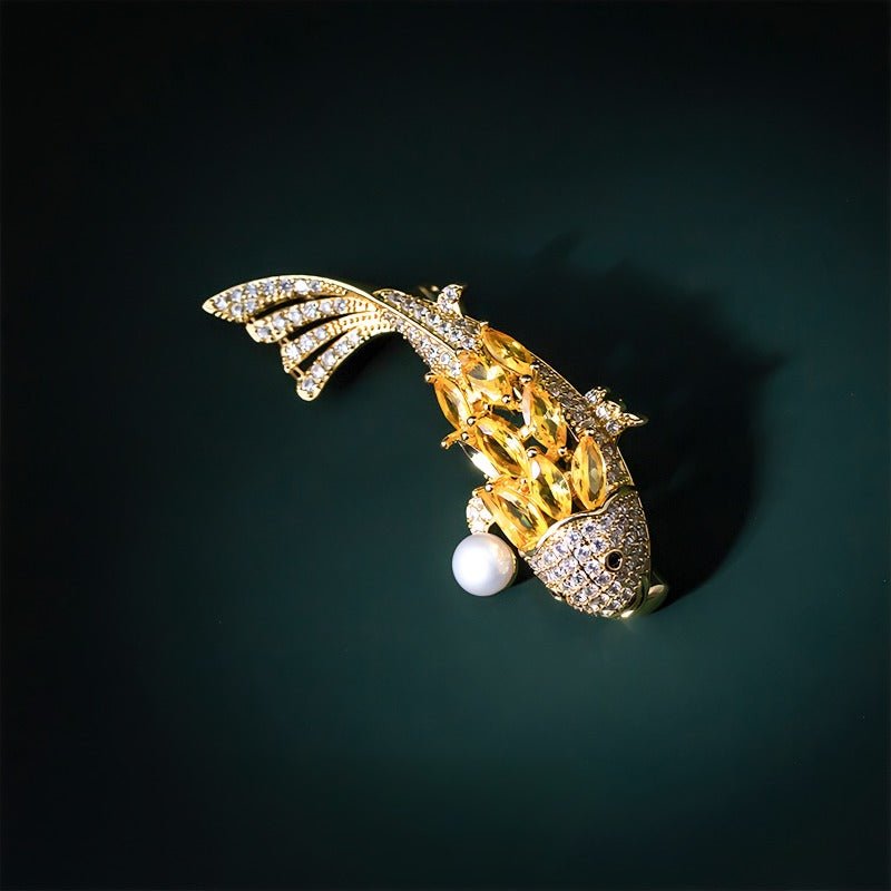De 18K vergulde afwerking benadrukt de organische lijnen van de vis en de gelaagde schubben, terwijl de zachte parel bij het hoofd een verfijnd en harmonieus tegenwicht biedt aan het meer dynamische ontwerp. De staart is gevormd met vloeiende krommen, wat de broche een licht en beweeglijk karakter geeft.