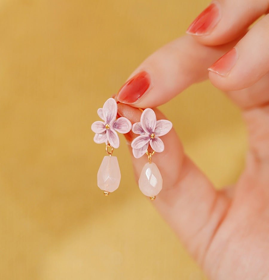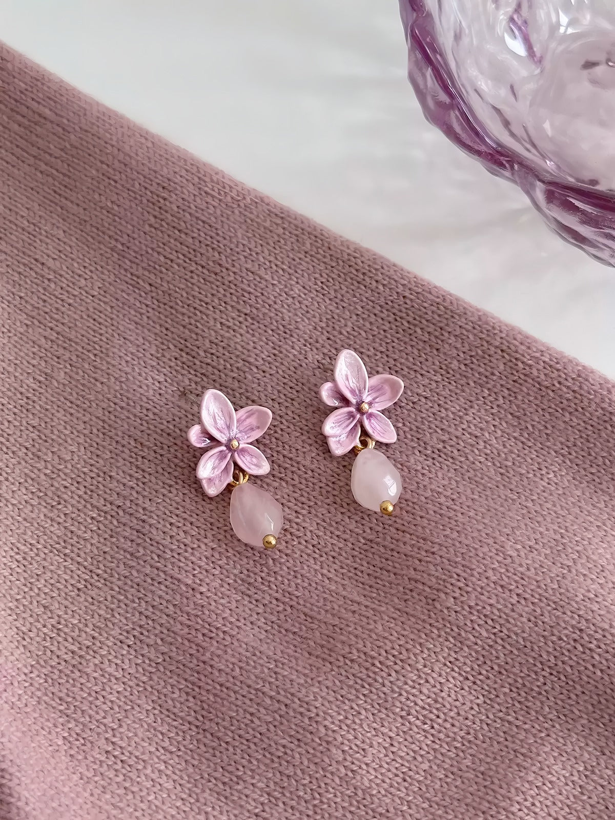 Disse smukke øreringe, håndlavet med stor omhu, kombinerer elegance og naturlig skønhed i en tidløs design. Hver ørering har en håndmalet lyserød blomst med fine detaljer og smukt grønne blade, som giver et friskt og naturligt udtryk. Det fine, håndværk sikrer, at hver blomst er unik.