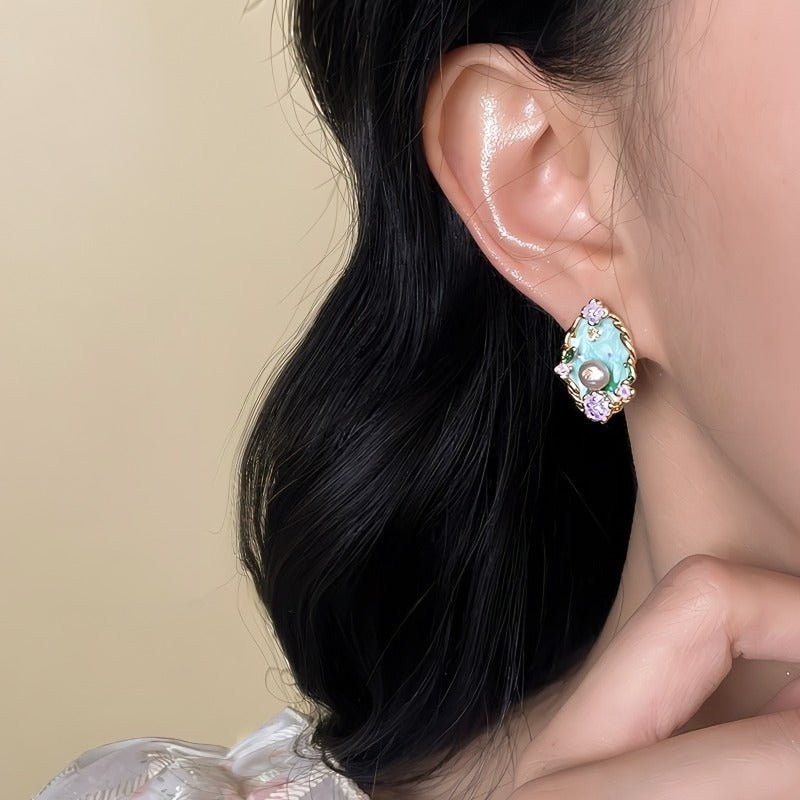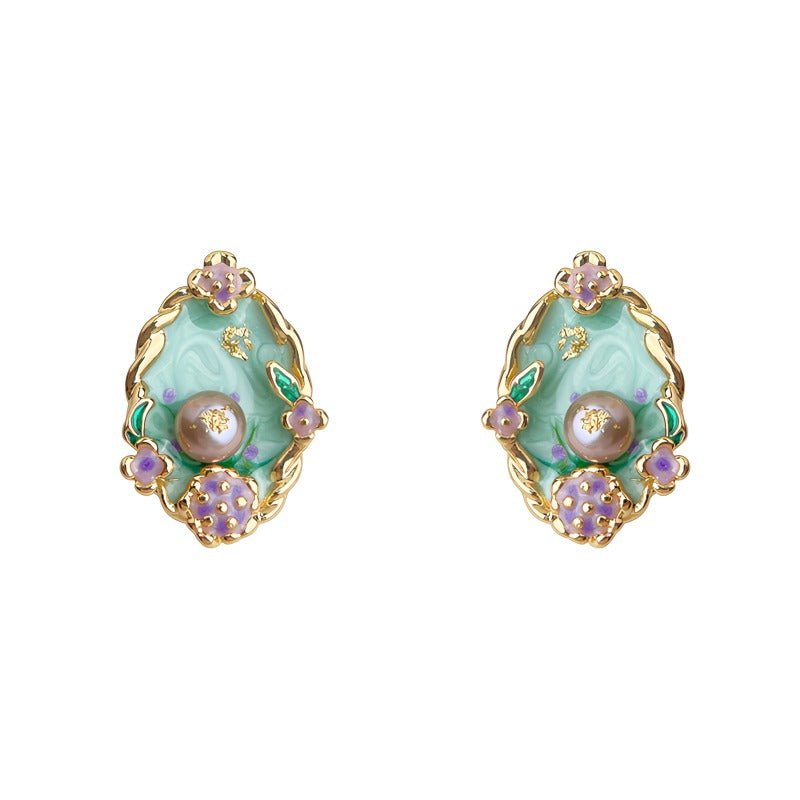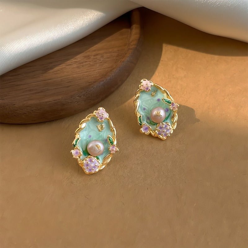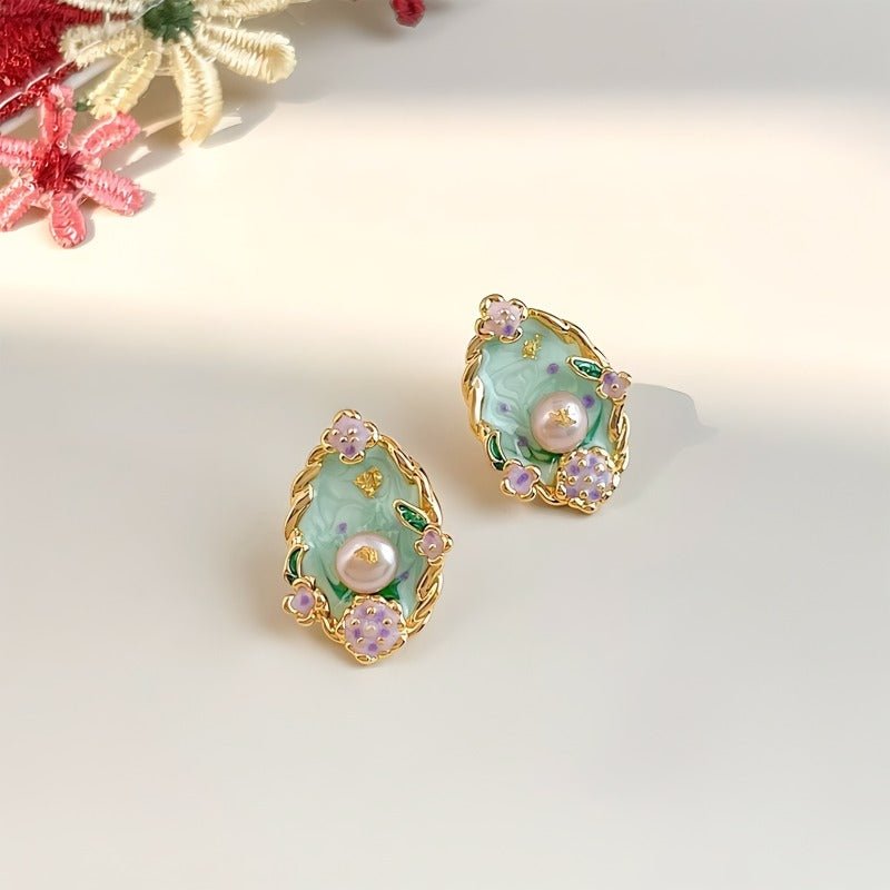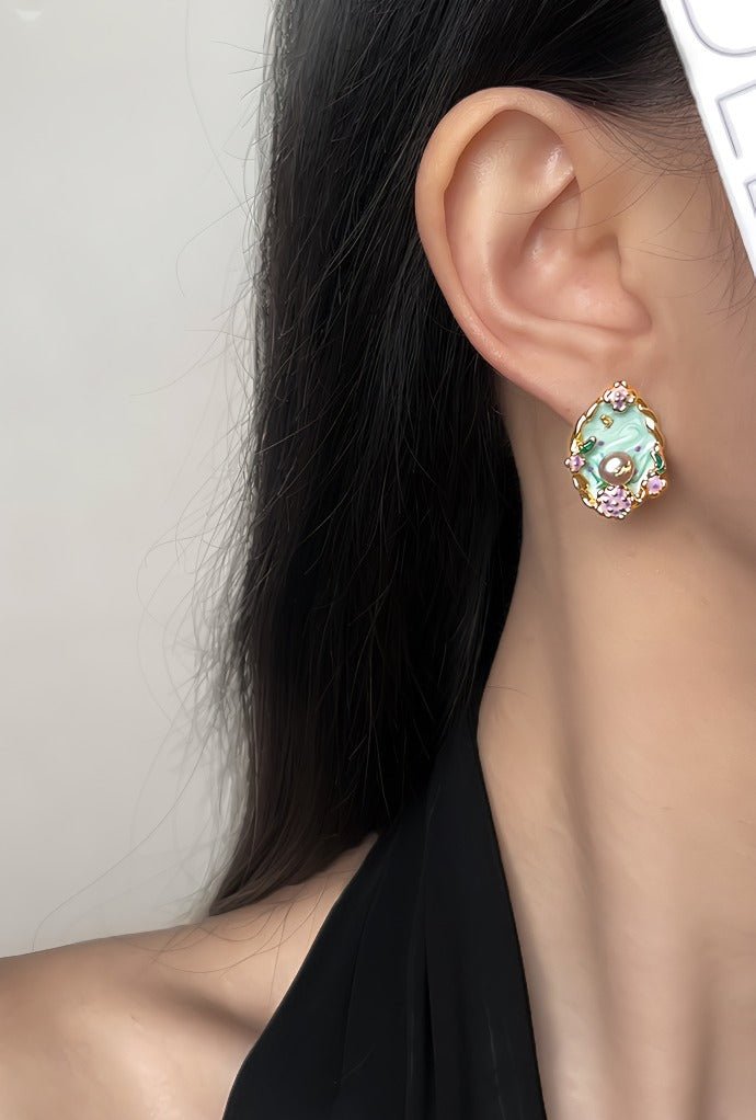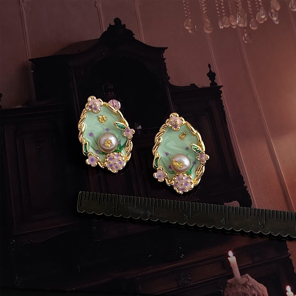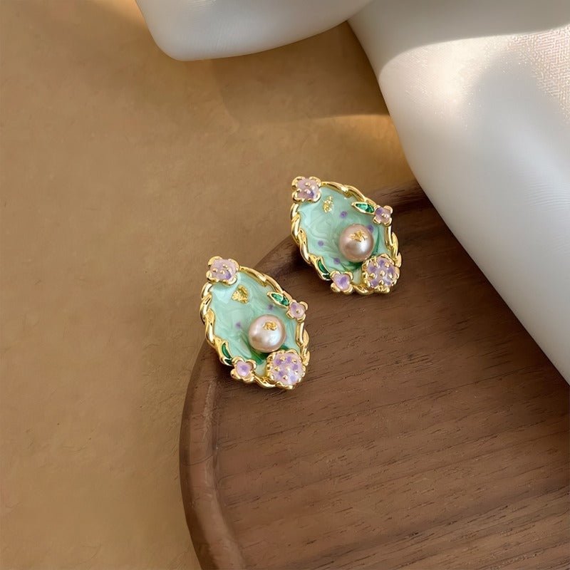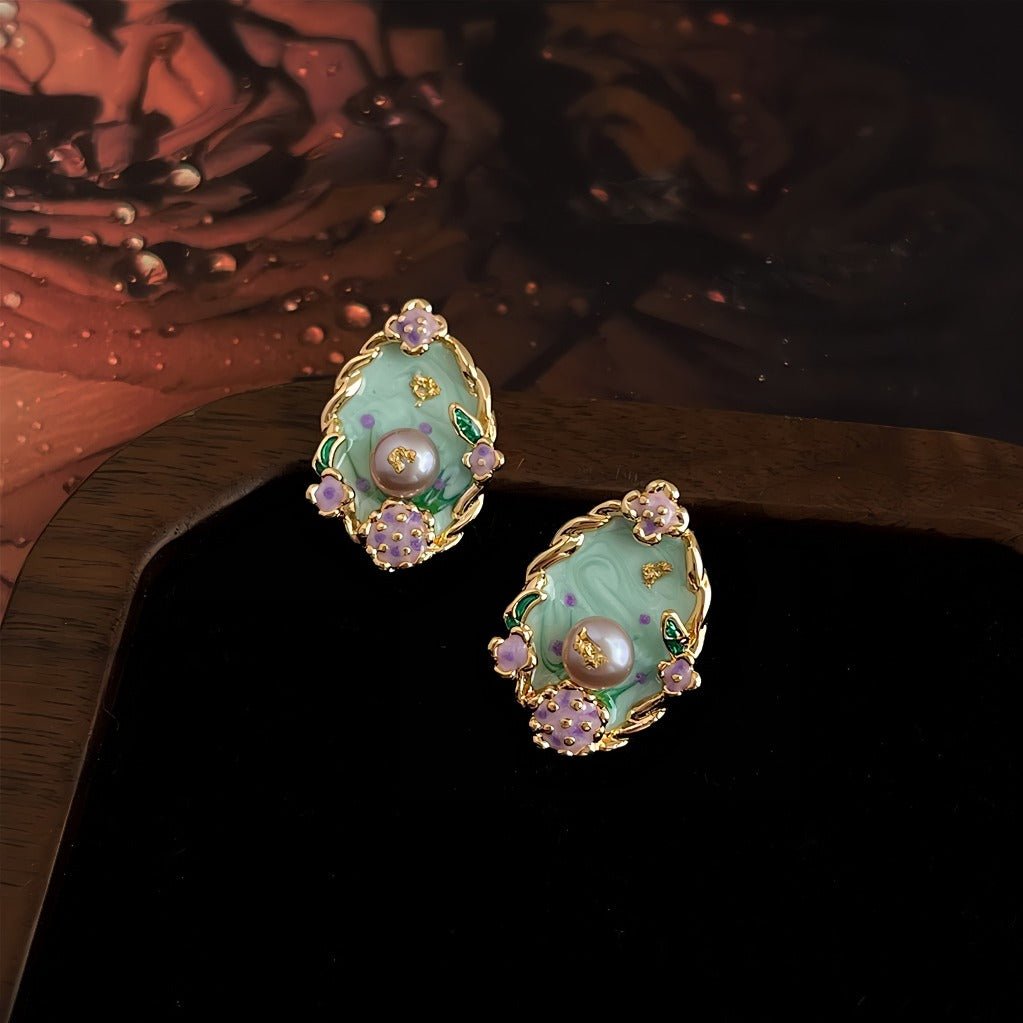 Disse elegante vintage-inspirerede øreringe er designet med fokus på detaljer og kunstnerisk udtryk. Den bløde grønne emalje kombineres med fine blomsterdetaljer og en smuk ferskvandsperle i midten, hvilket giver et eksklusivt og feminint look med tydelige referencer til renæssancens æstetik.