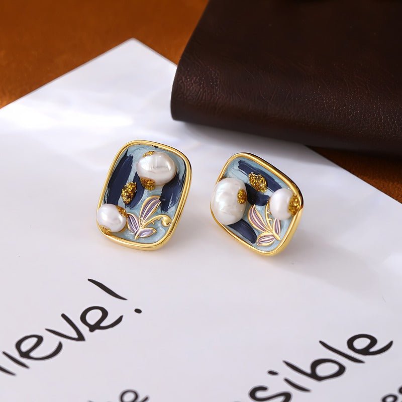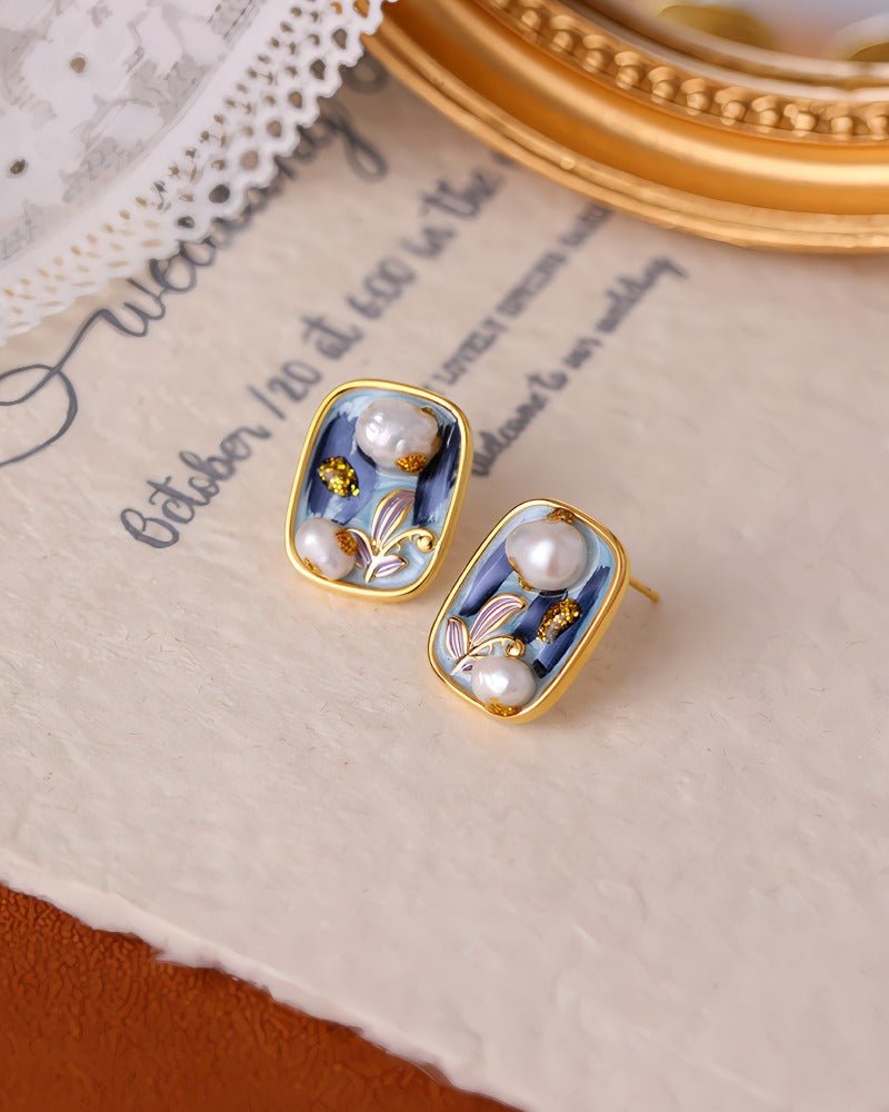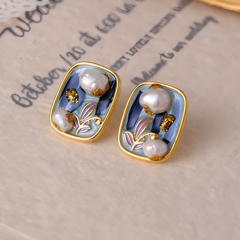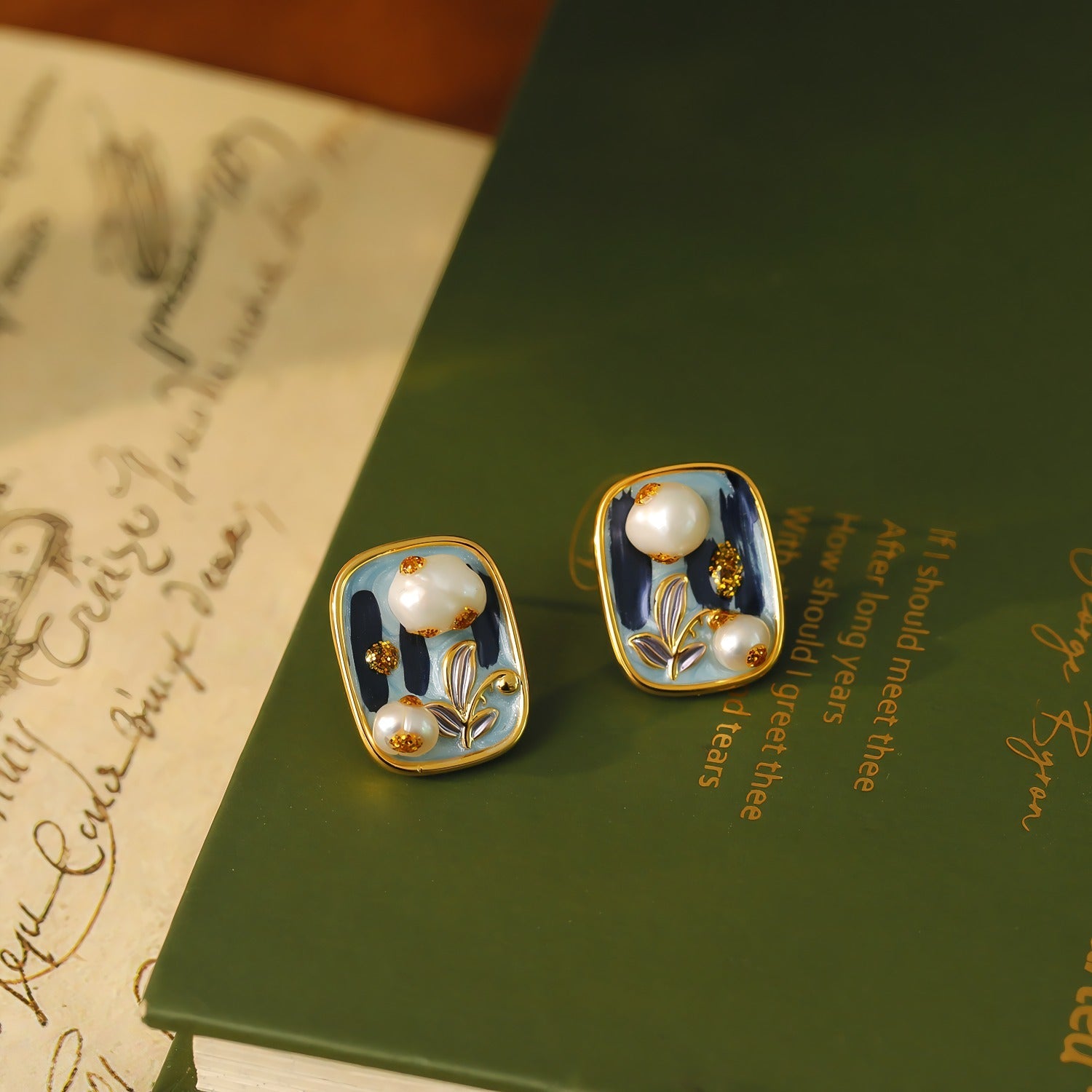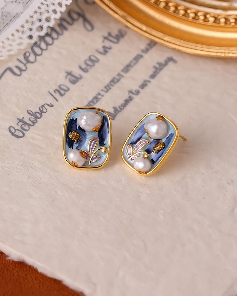 Disse kunstneriske barok-inspirerede øreringe kombinerer 18K forgyldt kobber med håndmalet emalje og naturlige ferskvandsperler, hvilket giver dem et elegant og klassisk udtryk. Designet er inspireret af oliemaleriernes rige farver og vintage æstetik, og det blå farvetema skaber en følelse af dybde og raffineret ro. Øreringene er monteret med hudvenlige 925 sølvnåle og er velegnede til både daglig brug og særlige lejligheder.