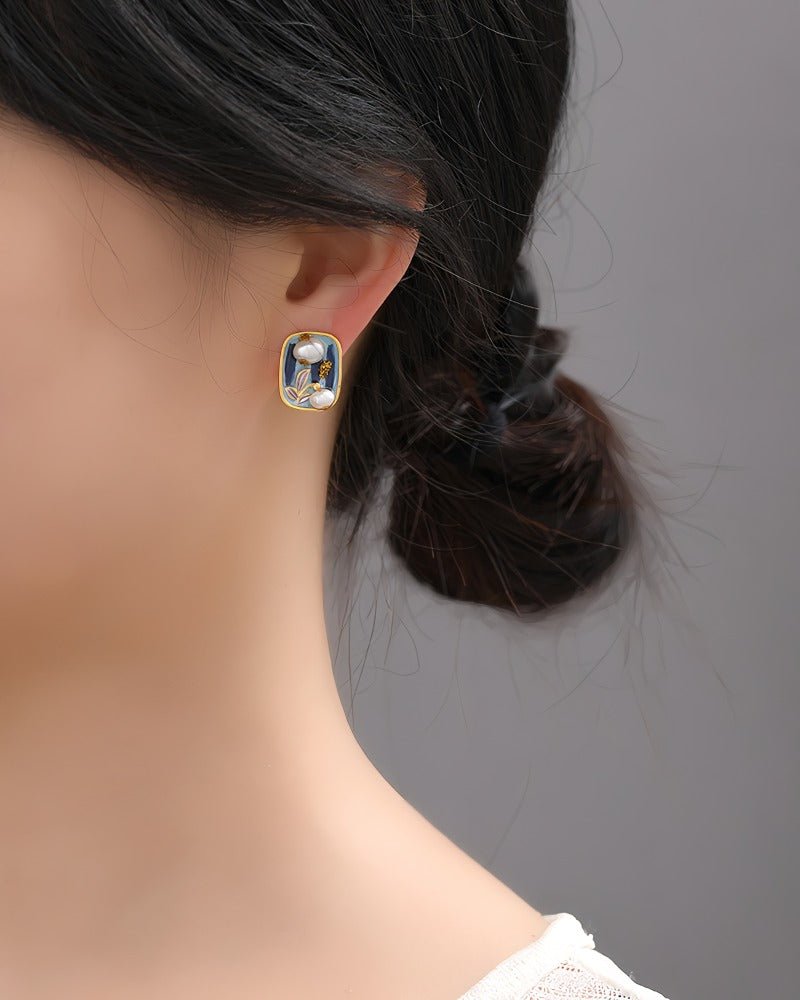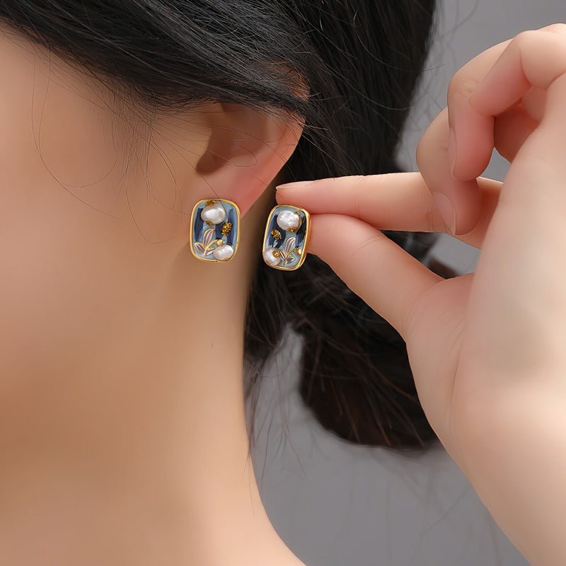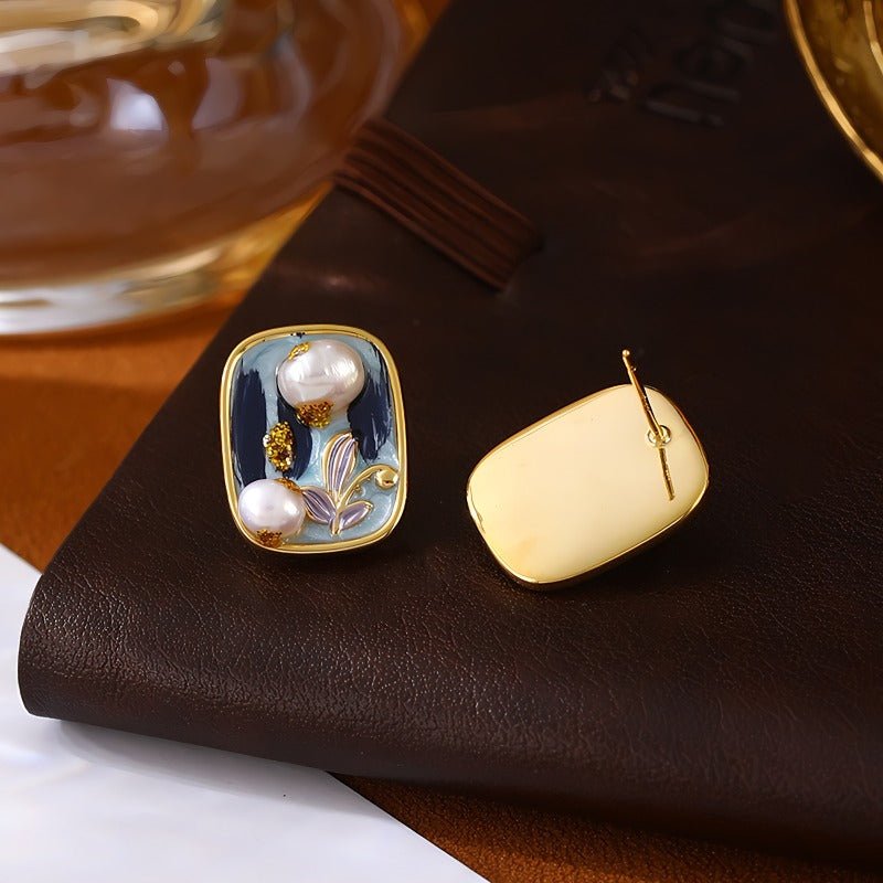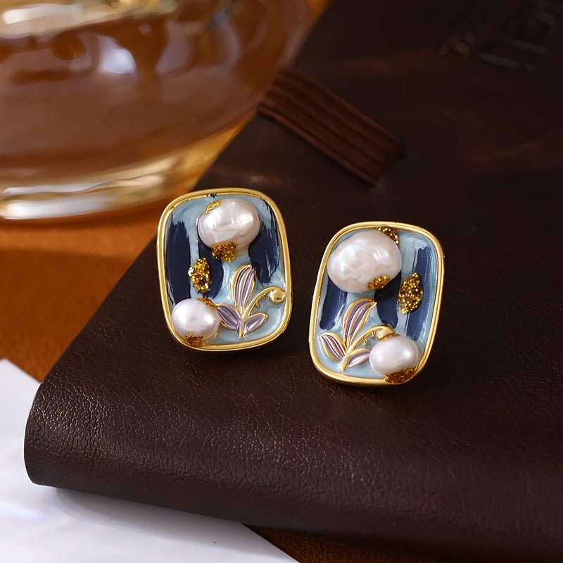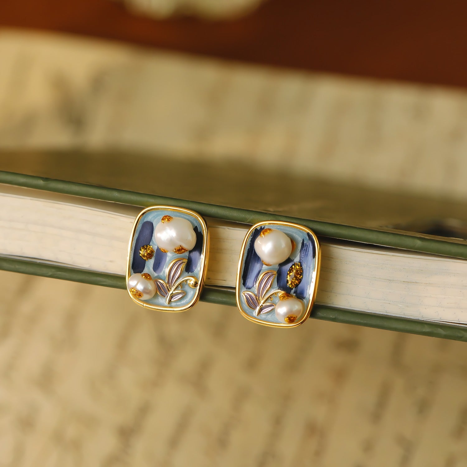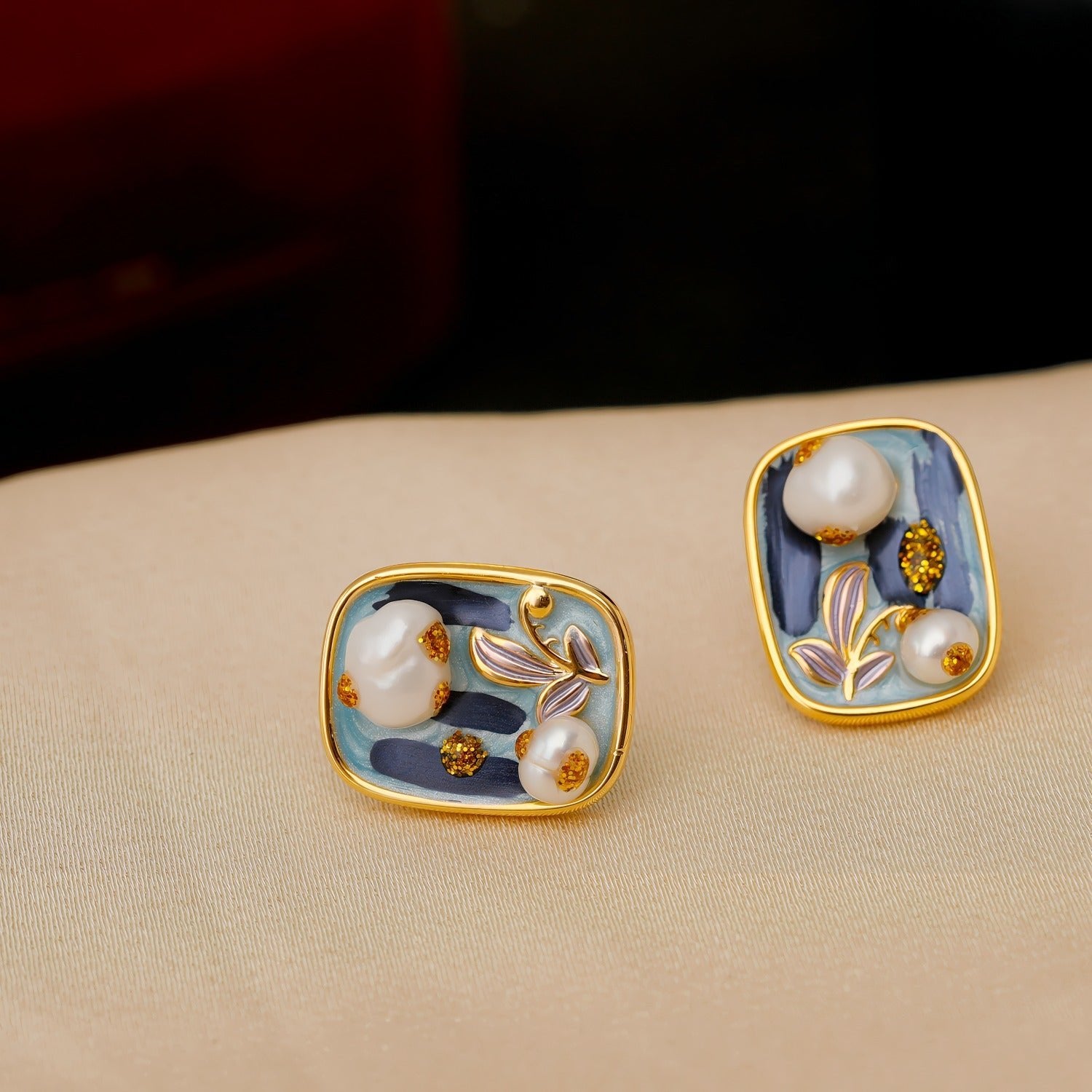 Disse kunstneriske barok-inspirerede øreringe kombinerer 18K forgyldt kobber med håndmalet emalje og naturlige ferskvandsperler, hvilket giver dem et elegant og klassisk udtryk. Designet er inspireret af oliemaleriernes rige farver og vintage æstetik, og det blå farvetema skaber en følelse af dybde og raffineret ro. Øreringene er monteret med hudvenlige 925 sølvnåle og er velegnede til både daglig brug og særlige lejligheder.