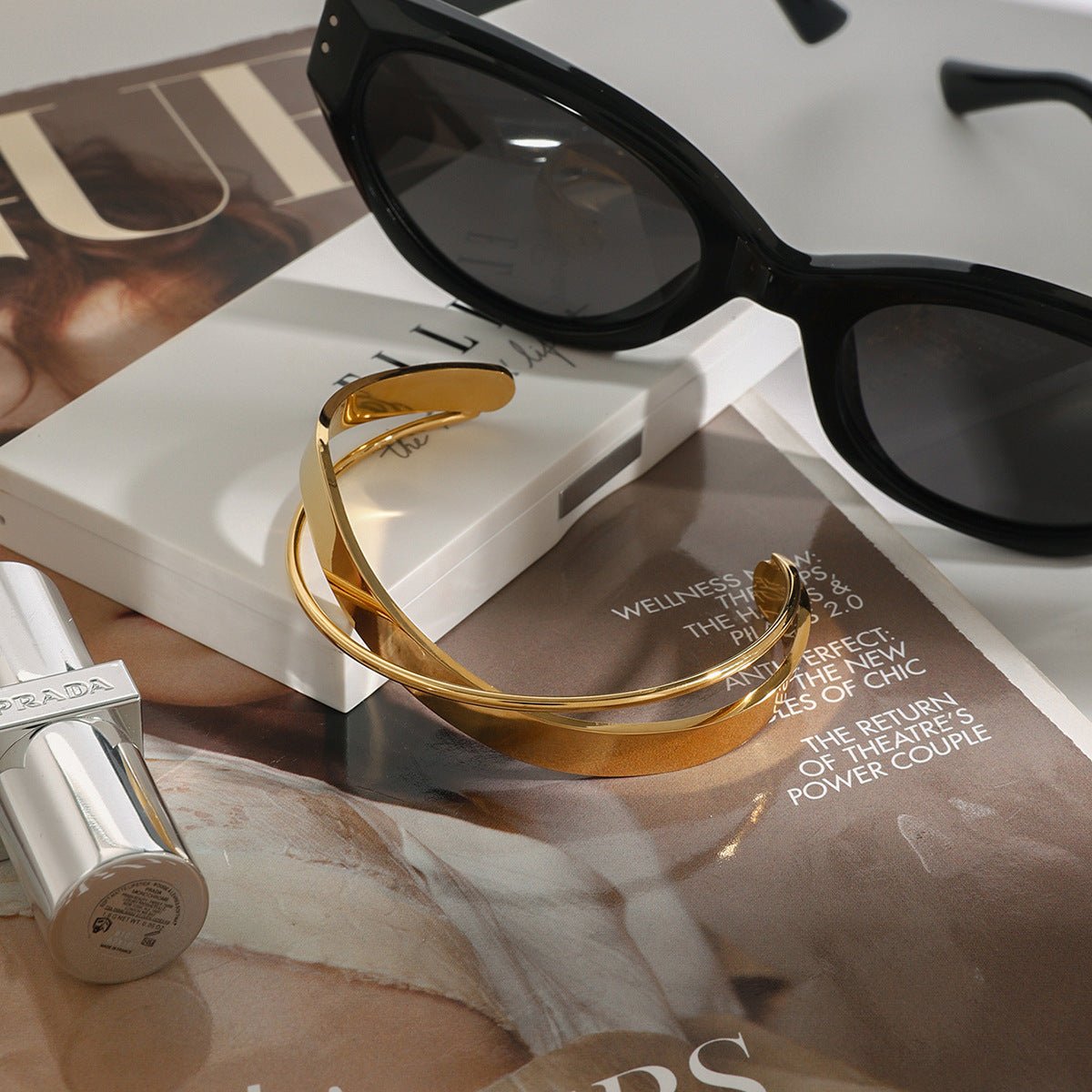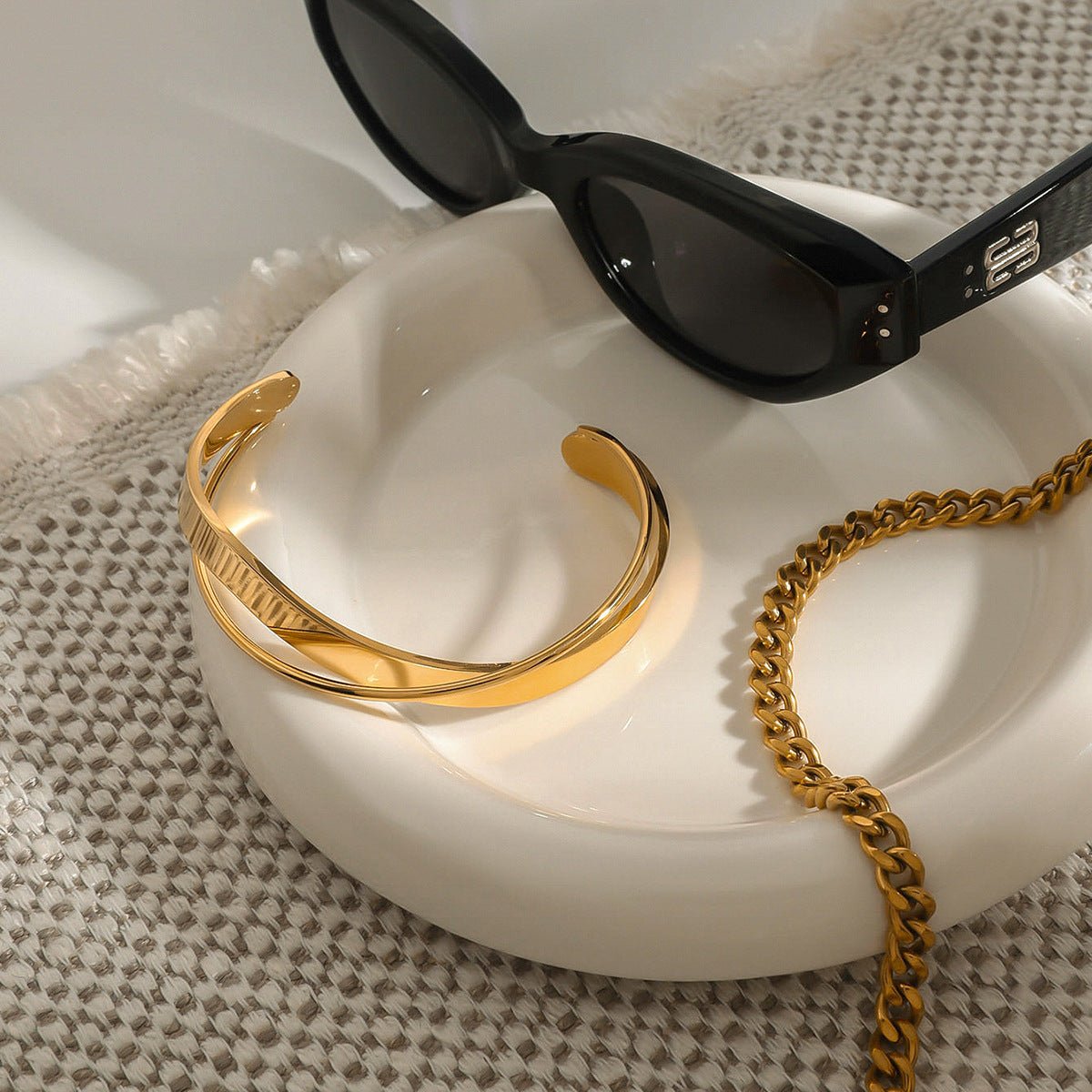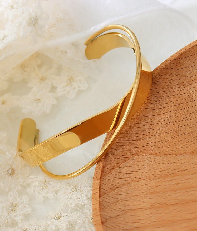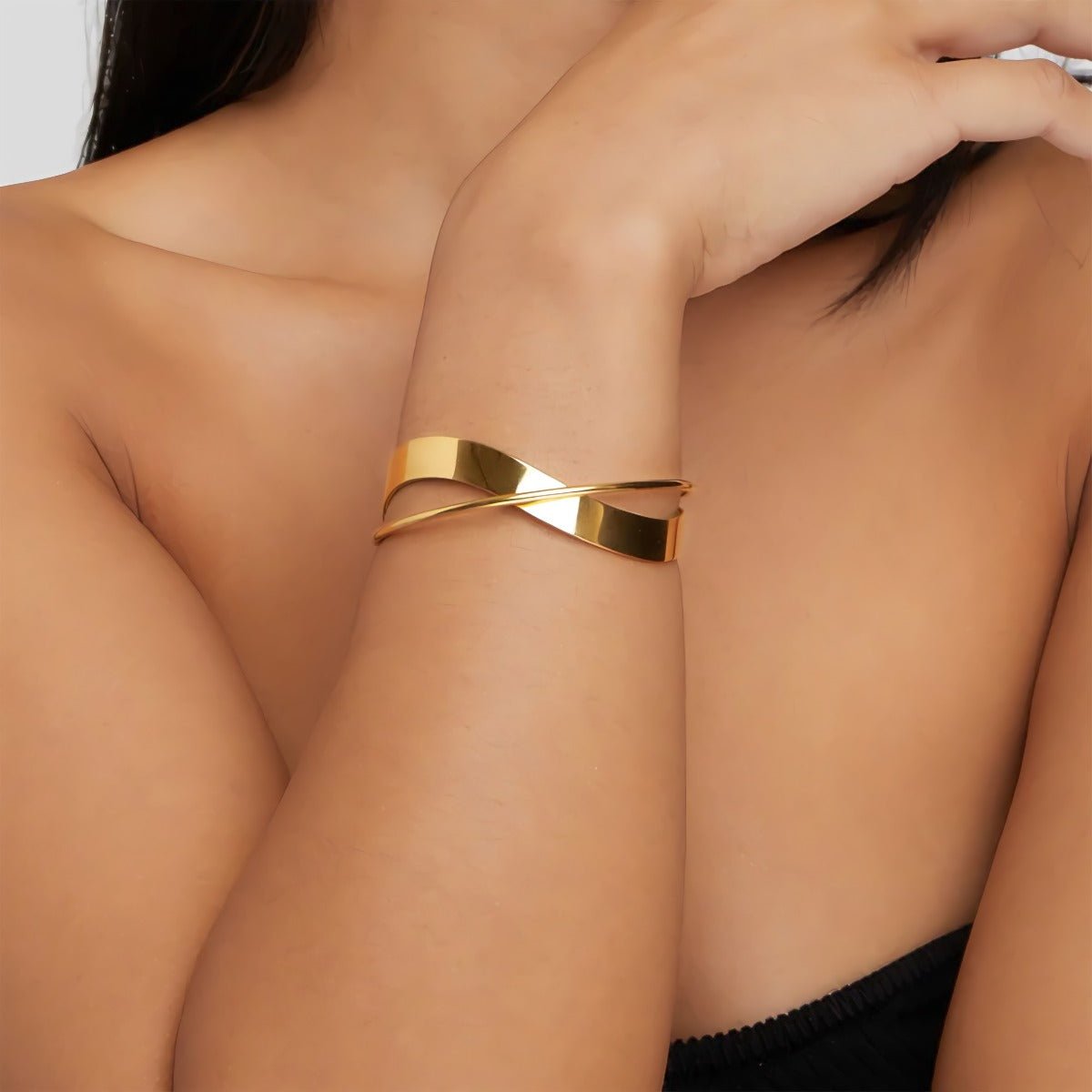 yta, som symboliserar balans och harmoni. Varje våg är noggrant utformad för att skapa en modern, flytande form, vilket gör armbandet både iögonfallande och mångsidigt. Den enkla korsdesignen ger en dynamisk och samtidigt elegant silhuett, perfekt för att skapa en sofistikerad look som kan bäras både till vardags och fest.