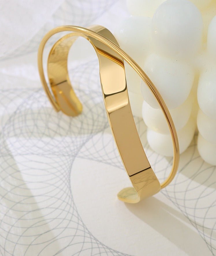 Detta armband är ett tidlöst och sofistikerat smycke som kombinerar minimalism med lyxiga material. Tillverkat av titaniumstål och belagd med 18K guld, vilket ger det både en fantastisk hållbarhet och en glänsande finish som varar länge. Den öppna, justerbara konstruktionen gör det enkelt att anpassa till olika handledsstorlekar, medan den lätta vikten säkerställer maximal komfort.