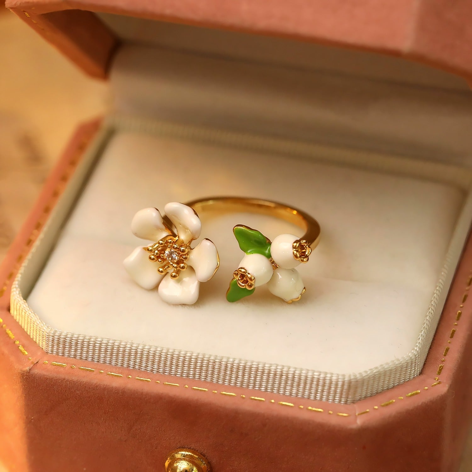Denna vackra blomster ring kombinerar romantisk naturinspiration med ett elegant och modernt uttryck. Ringen är tillverkad i koppar och belagd med 16K guld, dekorerad med handmålad vit emalj och glittrande zirkonia i mitten av blomman. De gröna bladen och de små knopparna tillför en frisk och feminin touch som gör ringen unik och full av liv.