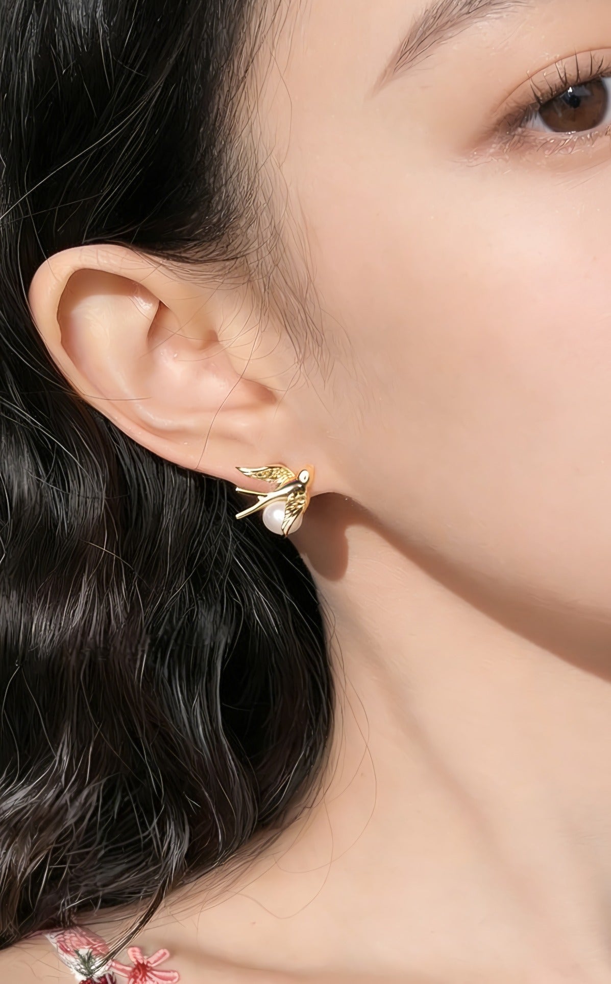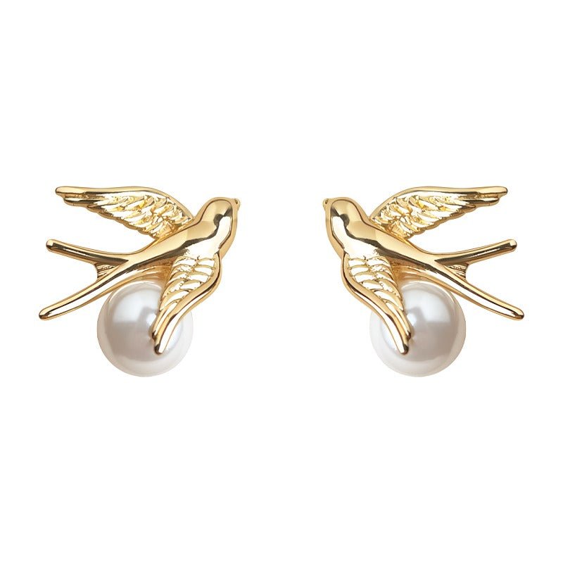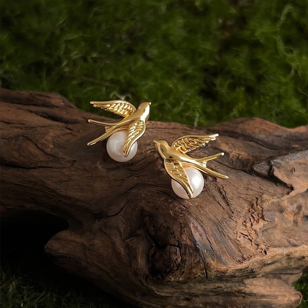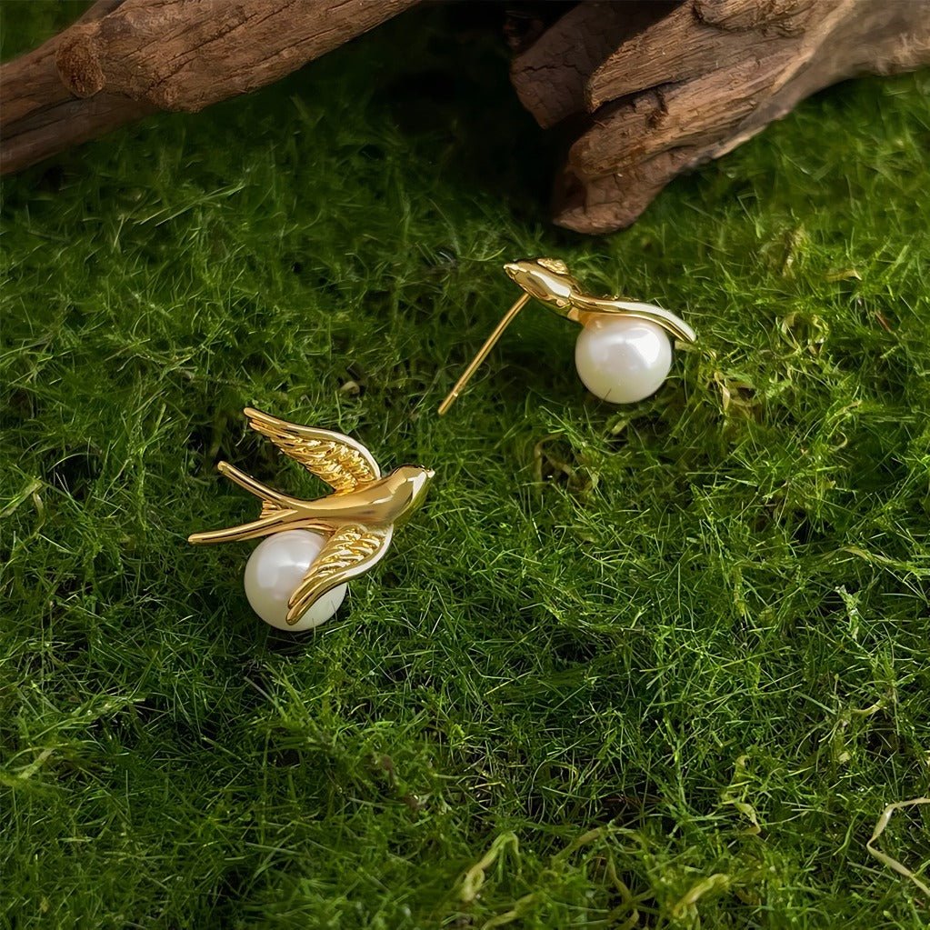 Under fågeln är en rund pärla med hög glans placerad, vilket skapar en vacker kontrast mellan rörelse och ro. Kombinationen av den dynamiska fågeln och den klassiska pärlan ger en harmonisk design där styrka och ynde möts. Pärlan tillför ett feminint och tidlöst element, medan fågeln tillför karaktär och symbolik.